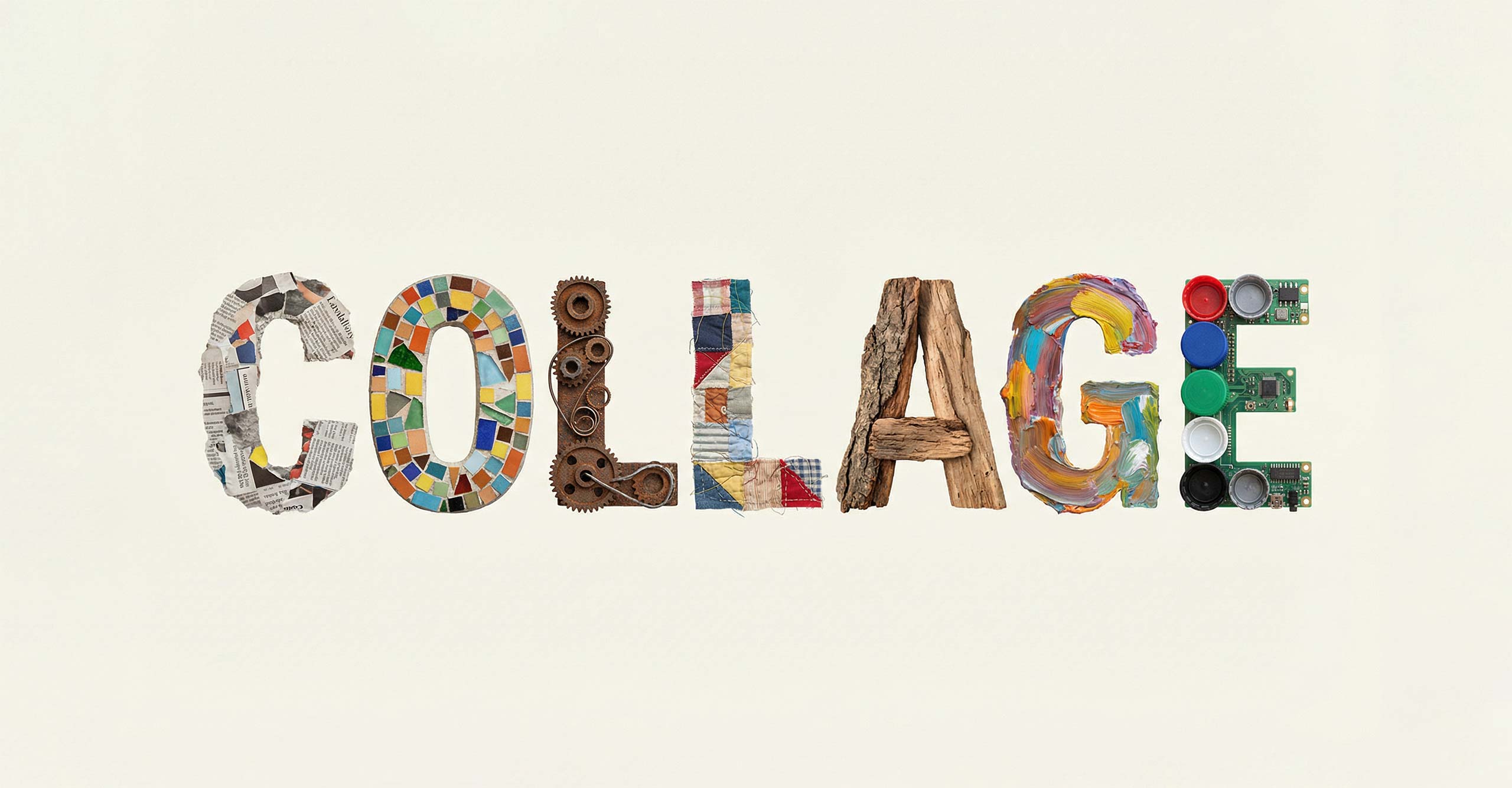 The Collage Type Collection recombines fragments from different styles, eras, and materials. Letterforms are built from found imagery, textures, and overlapping elements, embracing imperfection, chance, and the expressive power of combination. Meaning emerges through cutting, layering, and juxtaposition.