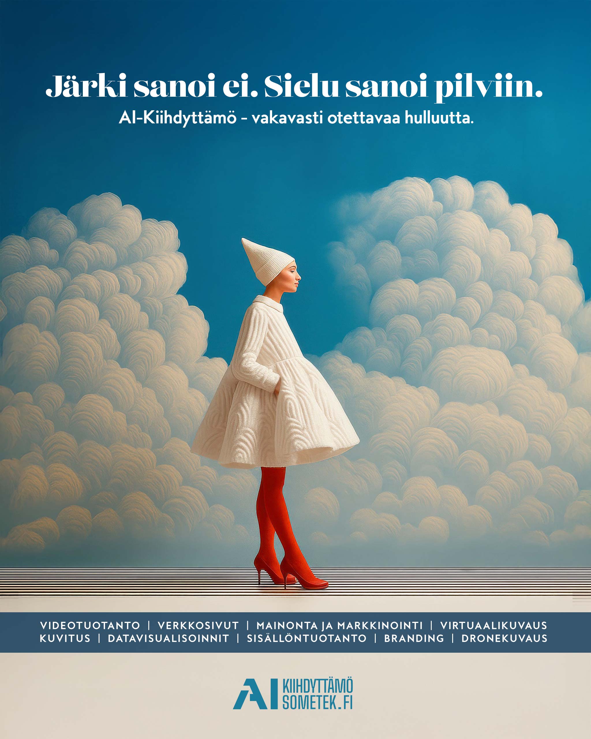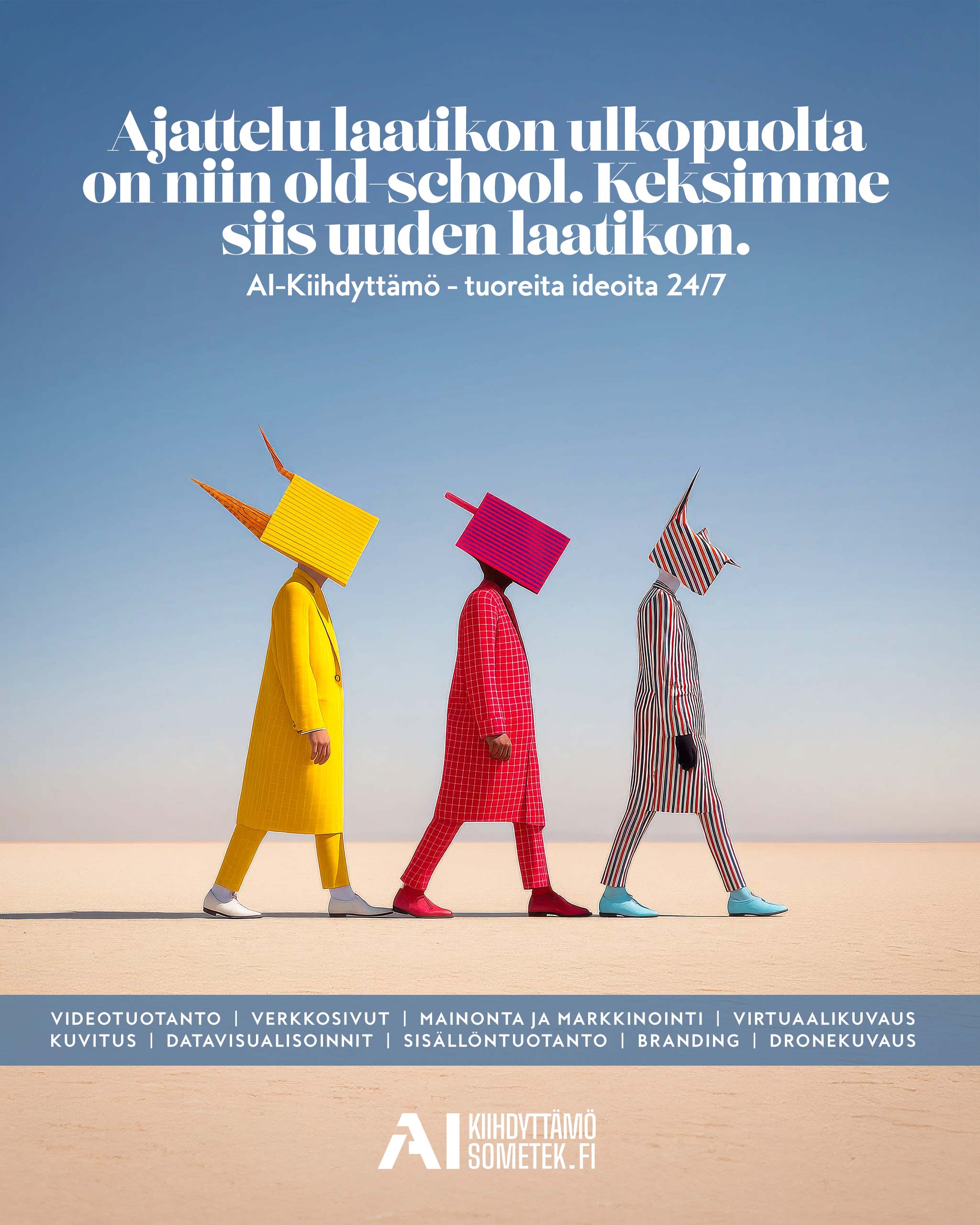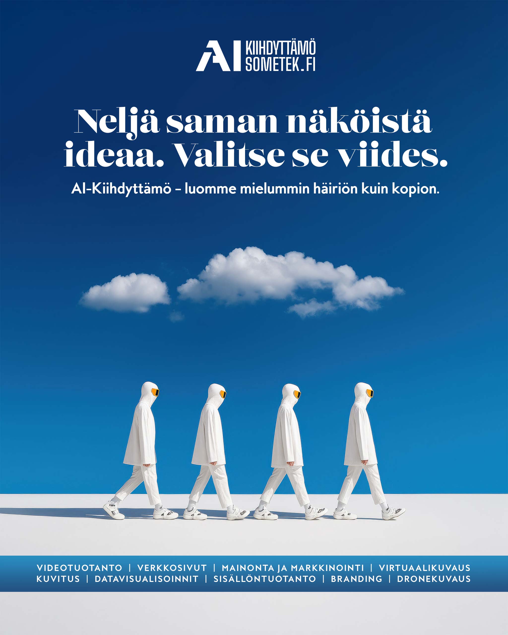 ”AI-Kiihdyttämö 52: Enemmän on enemmän” näyttää, miten mainoskonsepteja voidaan skaalata nollasta sataan tekoälyn avulla. Idea oli nopealla aikataululla luoda mainossarja, jossa on tuore mutta tunnistettava mainos vuoden jokaisen viikolle. Haaste auttoi hiomaan luovan prosessin ja työnkulut tehokkaiksi – raakaideoiden tuottamisesta mainosten visualisointiin, jalostamiseen ja konseptien skaalaamiseen.