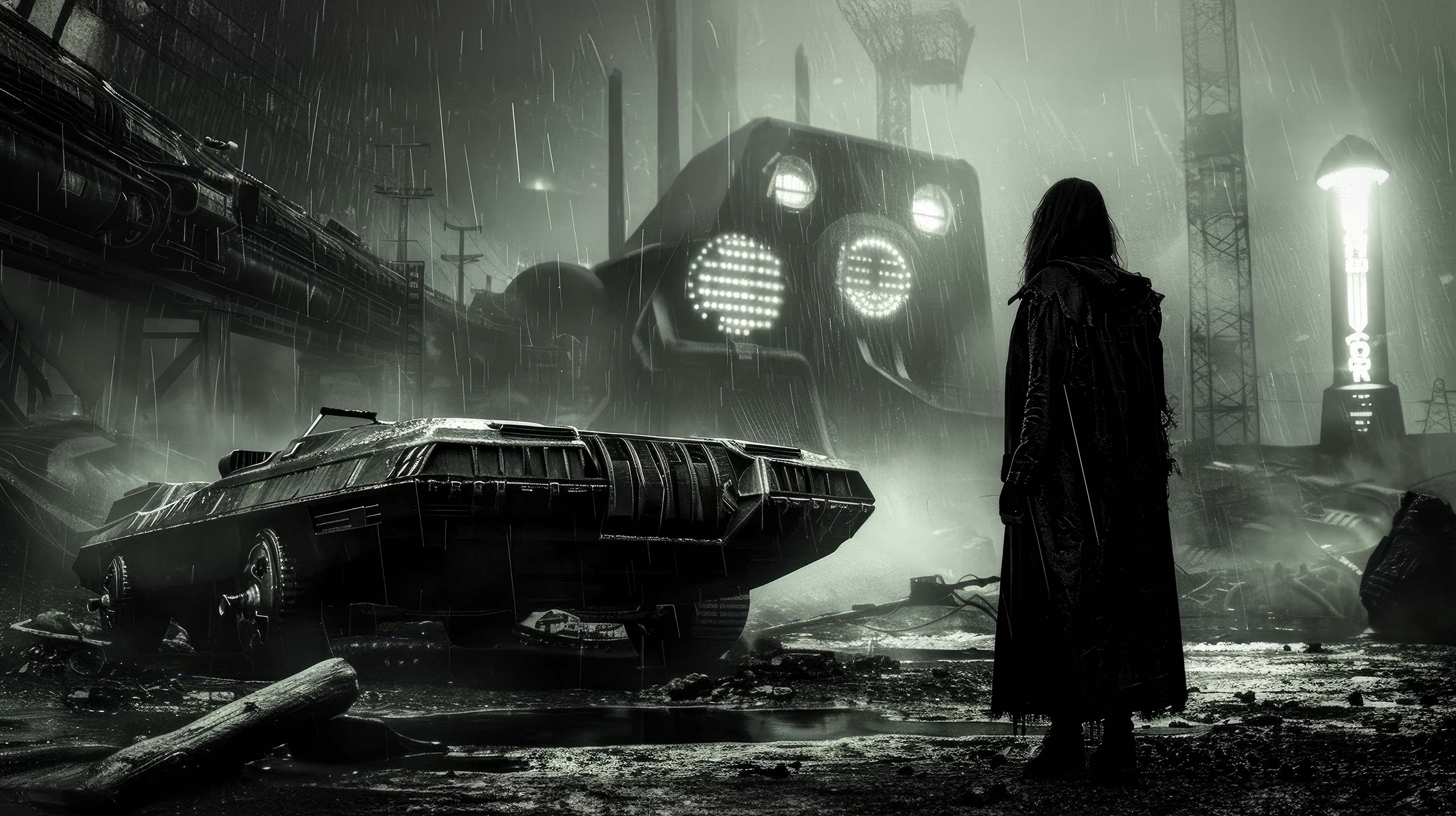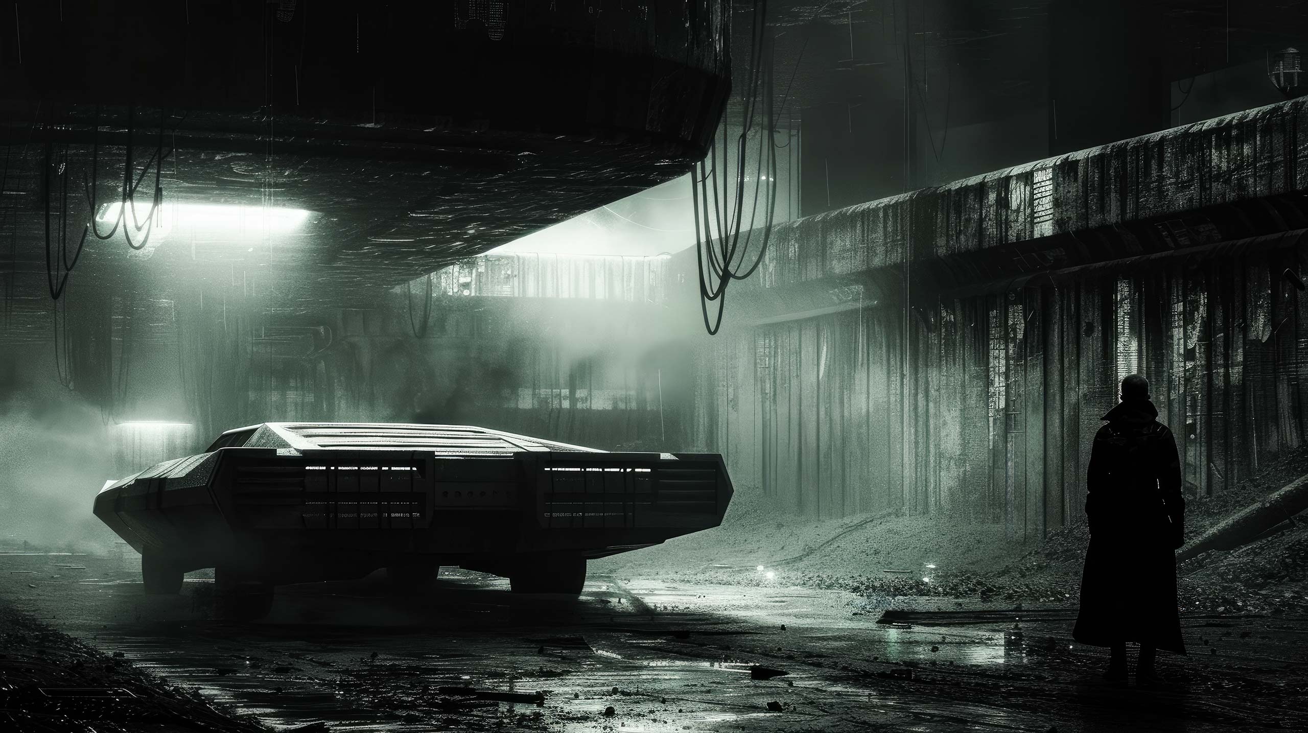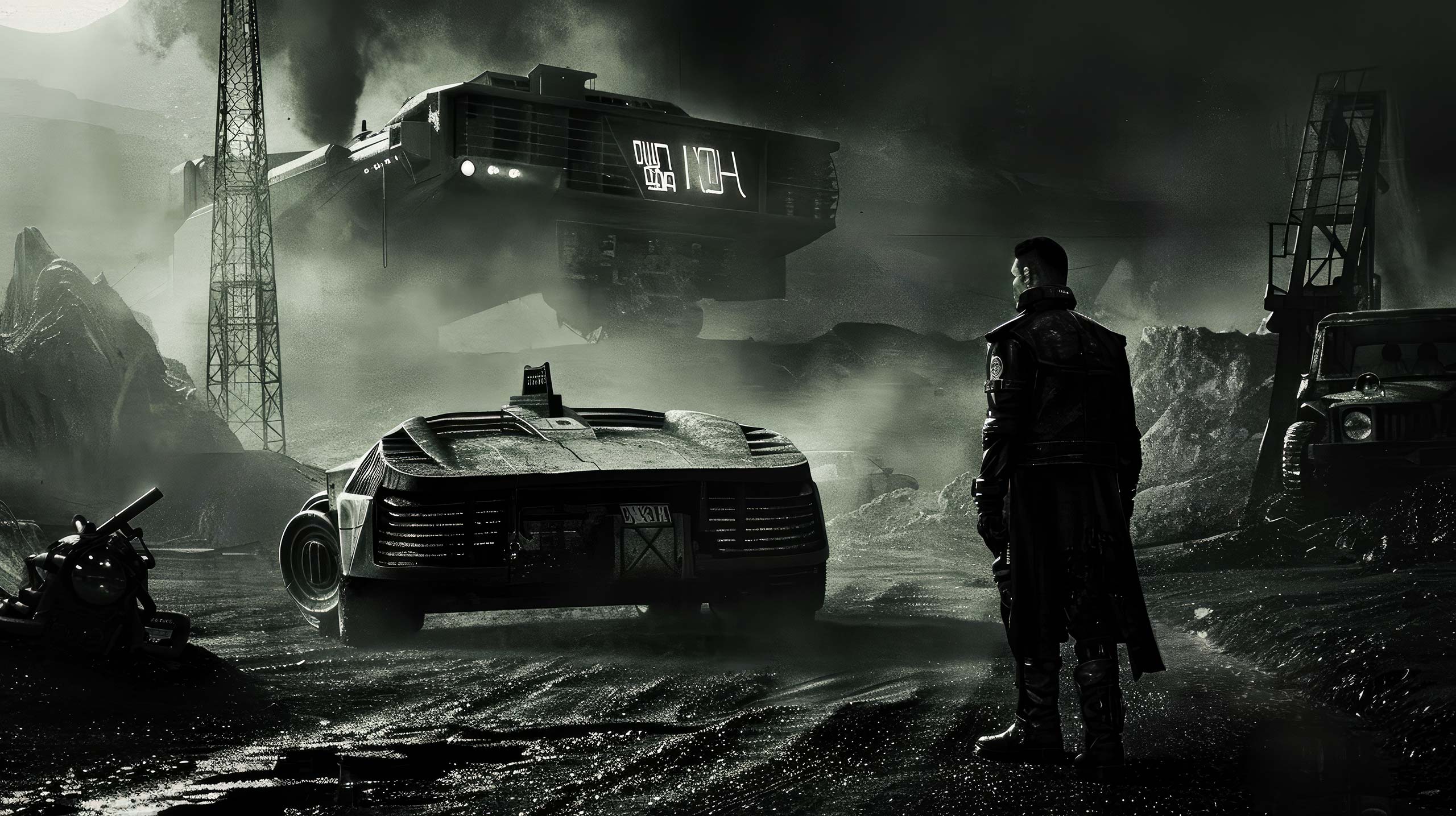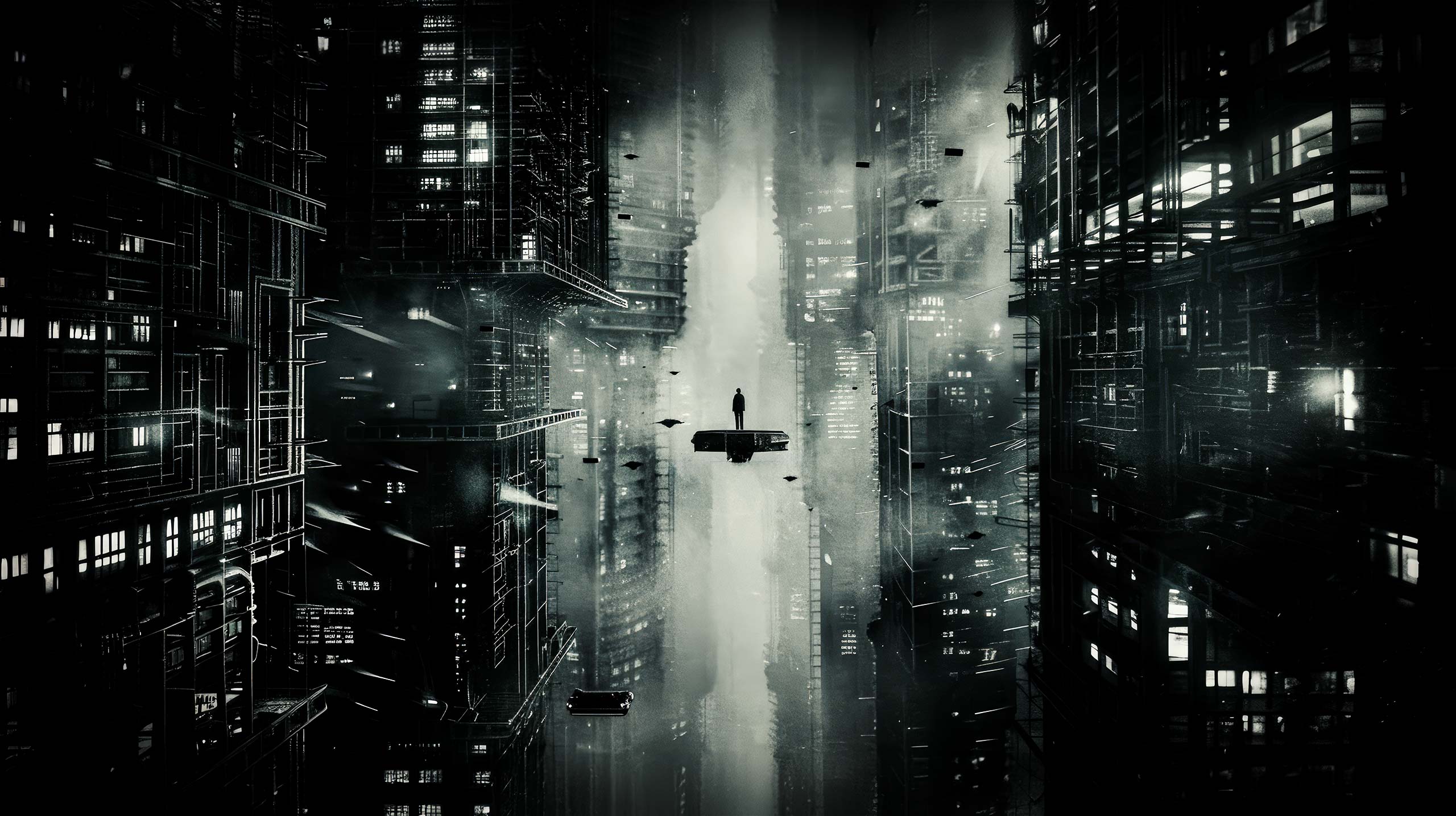 Futuro Noir embraces the dramatic black-and-white aesthetic of film noir and takes it to a sci-fi setting. The artwork consists of over 50 cinematic scenes and a film trailer, that evolves into parody, highlighting the limitations of AI-generated videos. The collection of 50+ images creates a moody and bleak retro-futuristic world, serving as a moodboard for a film that never was.