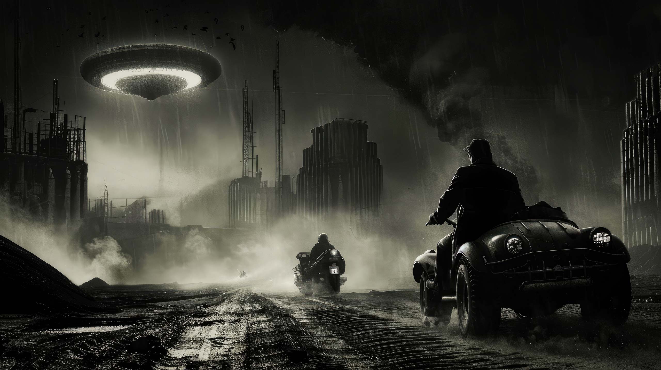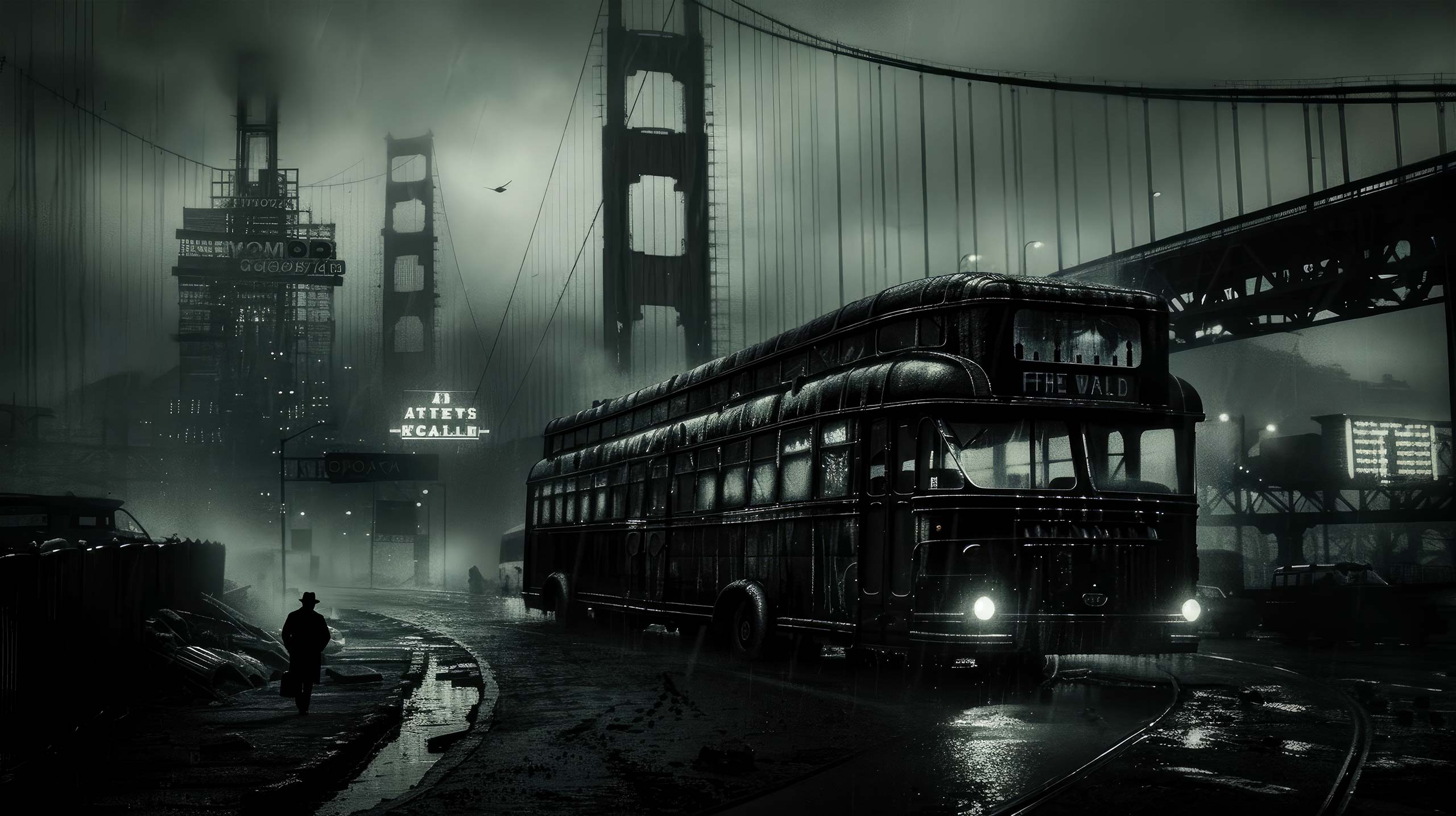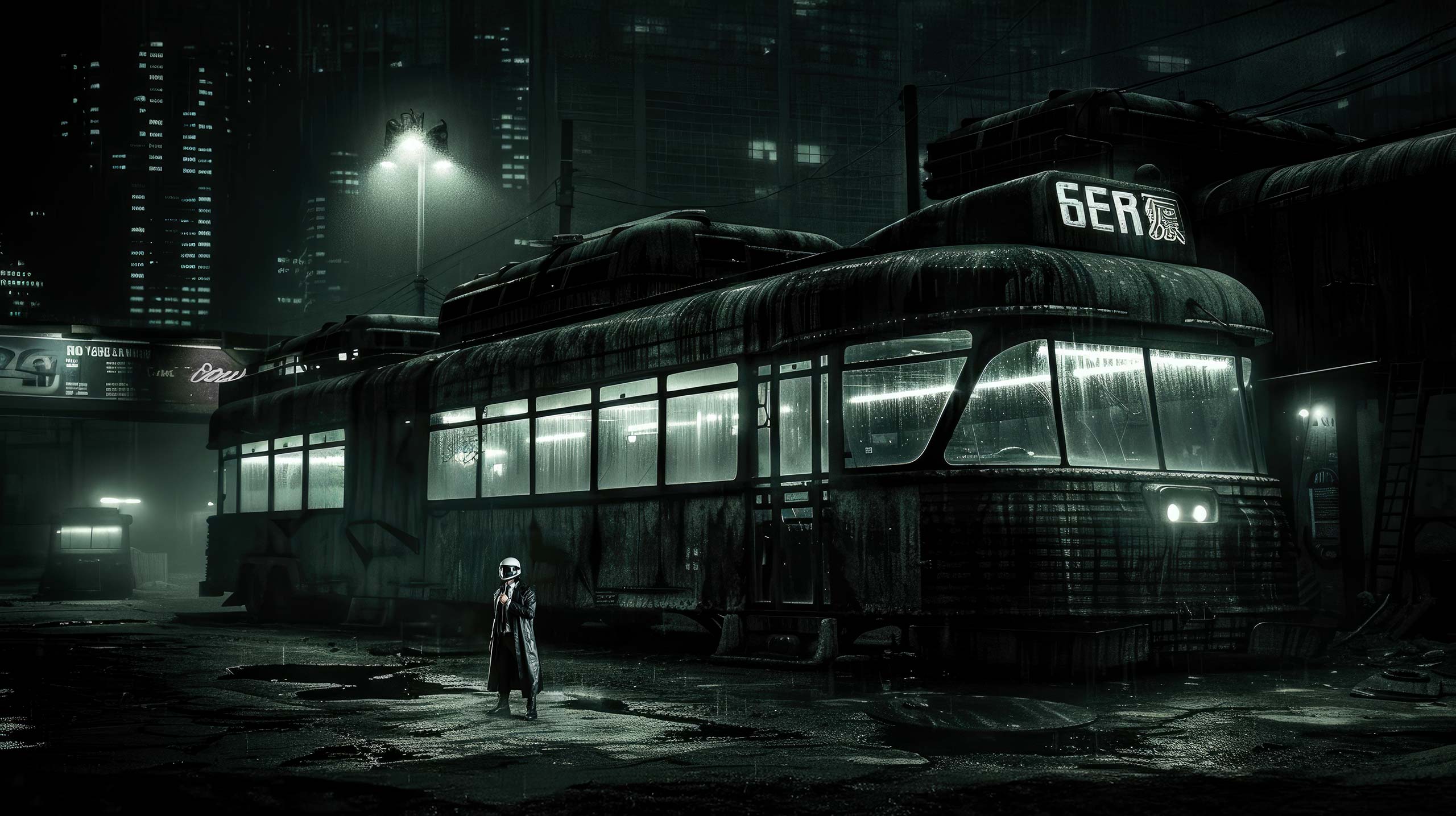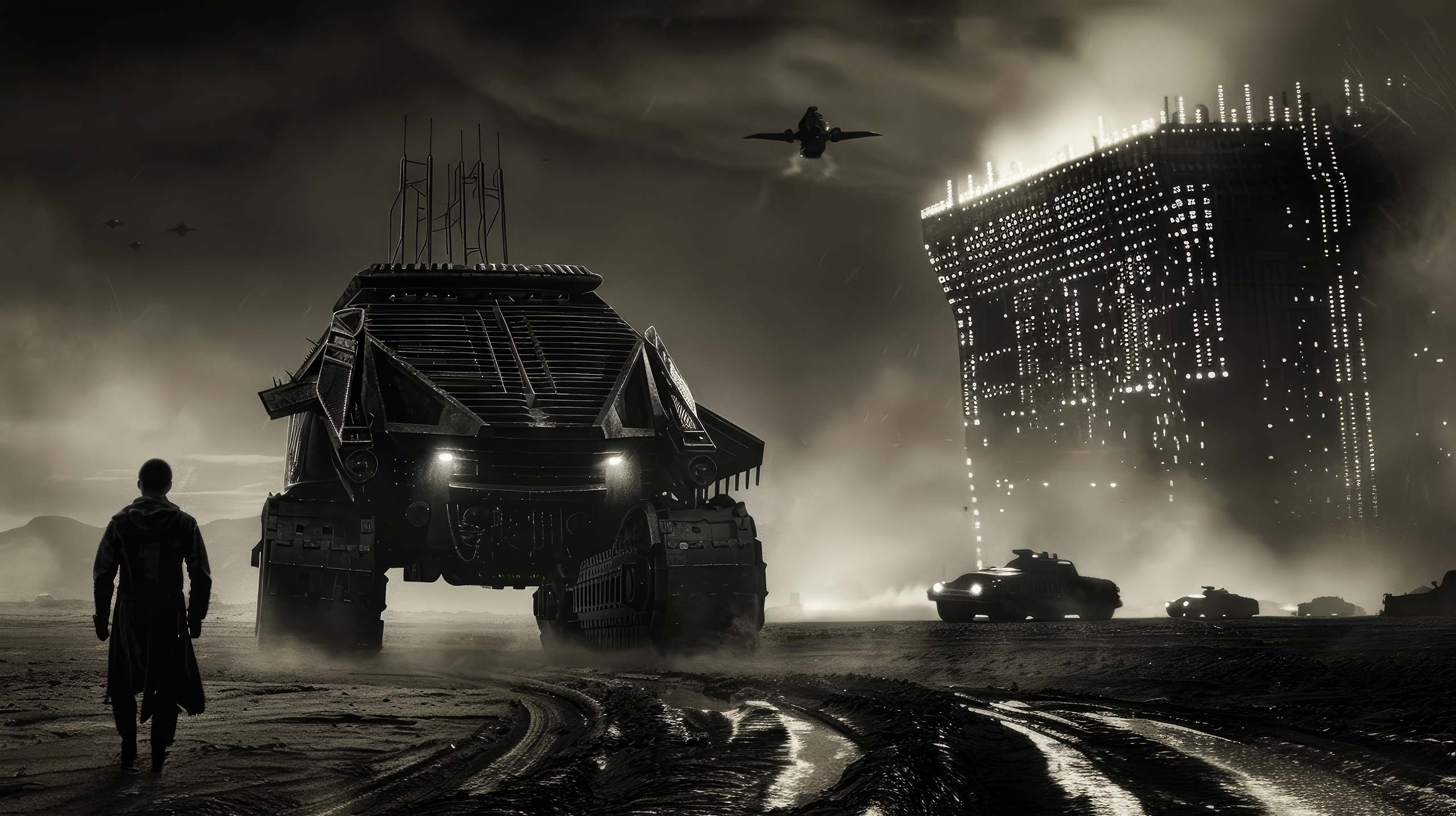 Futuro Noir embraces the dramatic black-and-white aesthetic of film noir and takes it to a sci-fi setting. The artwork consists of over 50 cinematic scenes and a film trailer, that evolves into parody, highlighting the limitations of AI-generated videos. The collection of 50+ images creates a moody and bleak retro-futuristic world, serving as a moodboard for a film that never was.