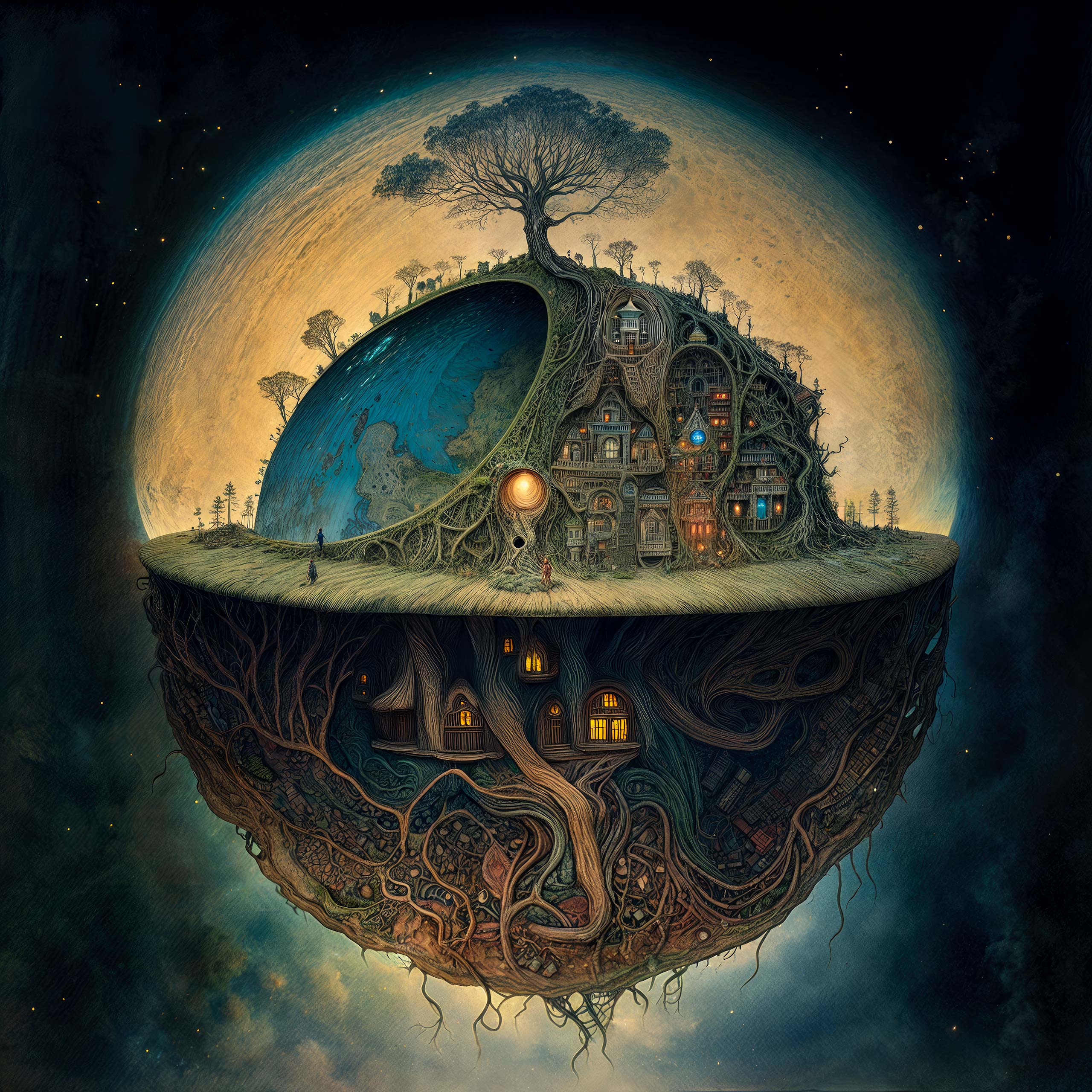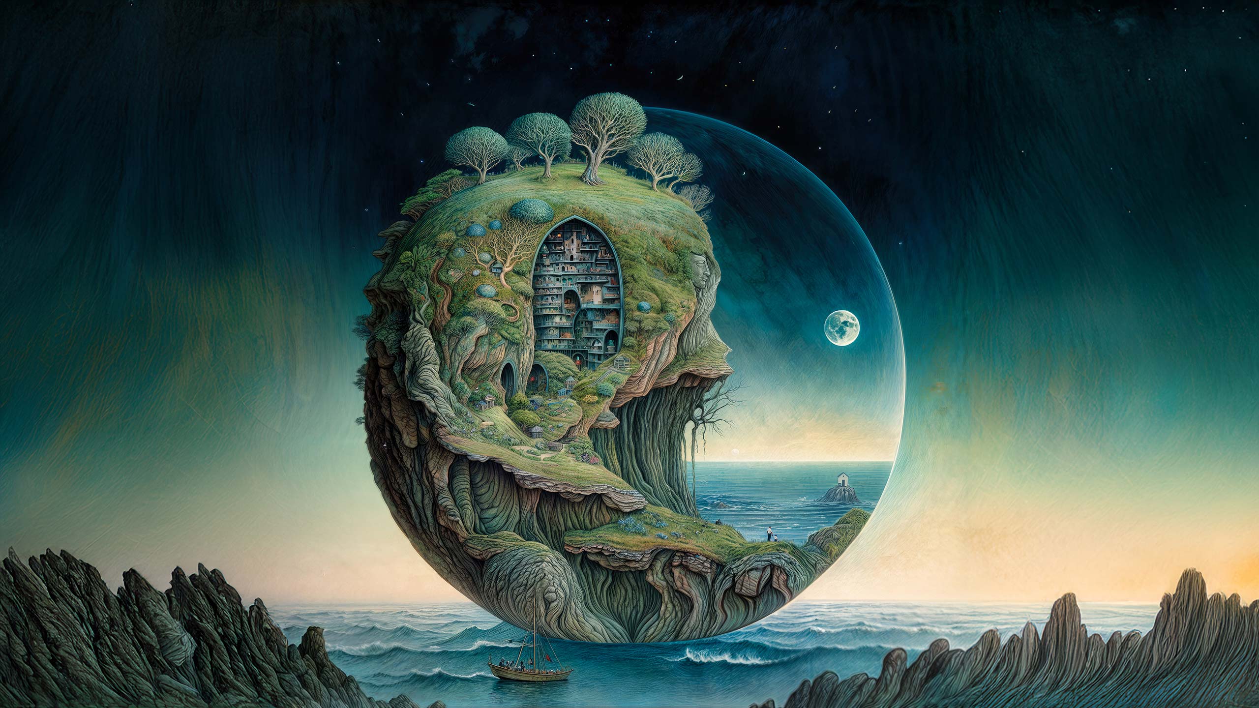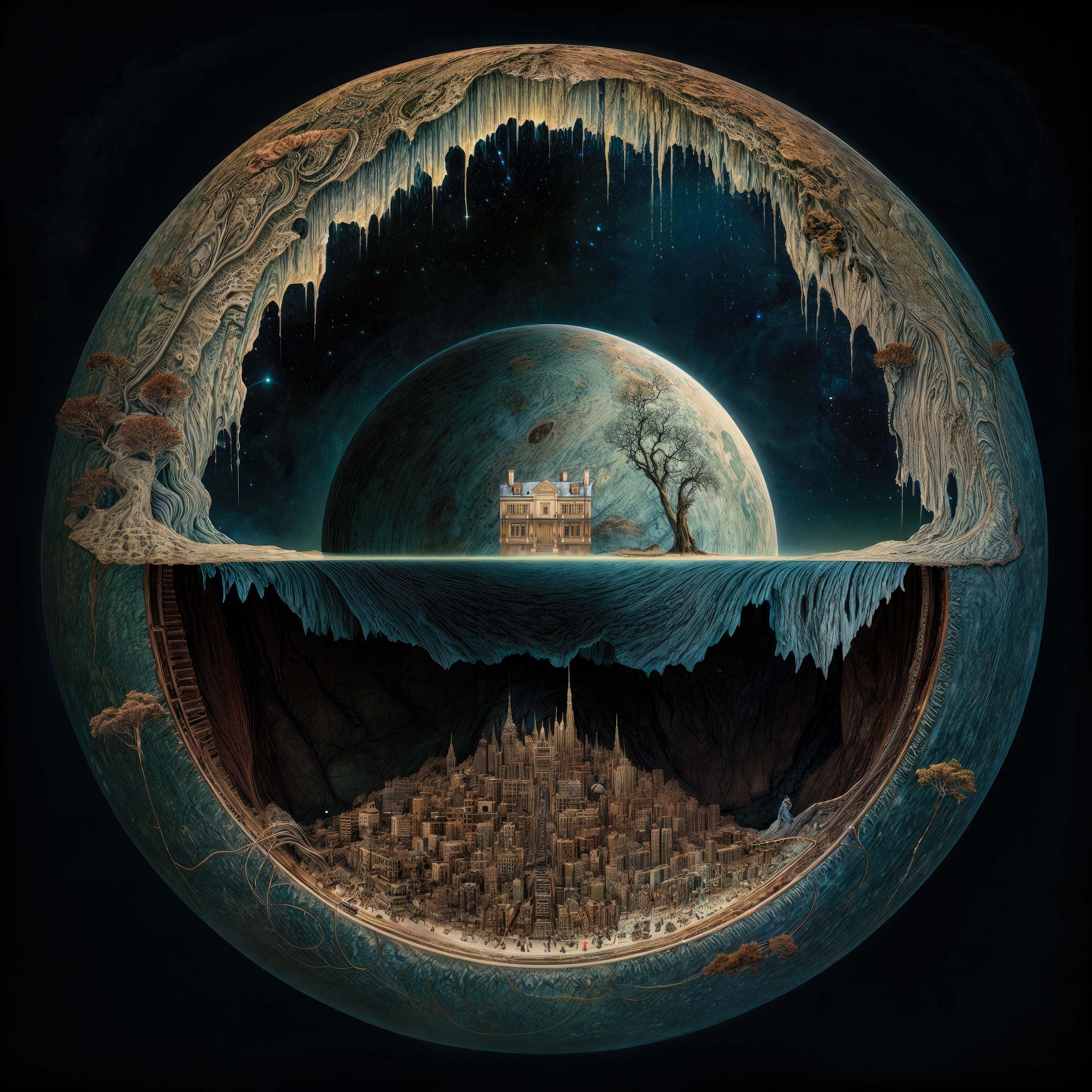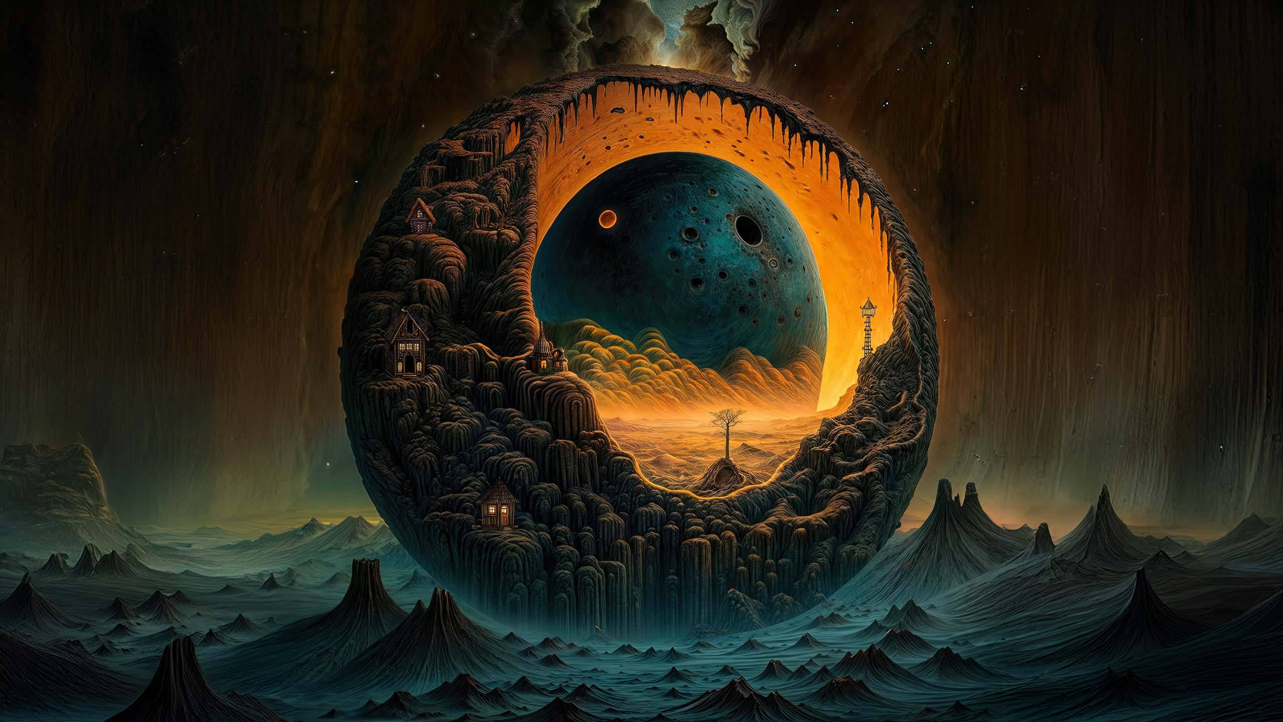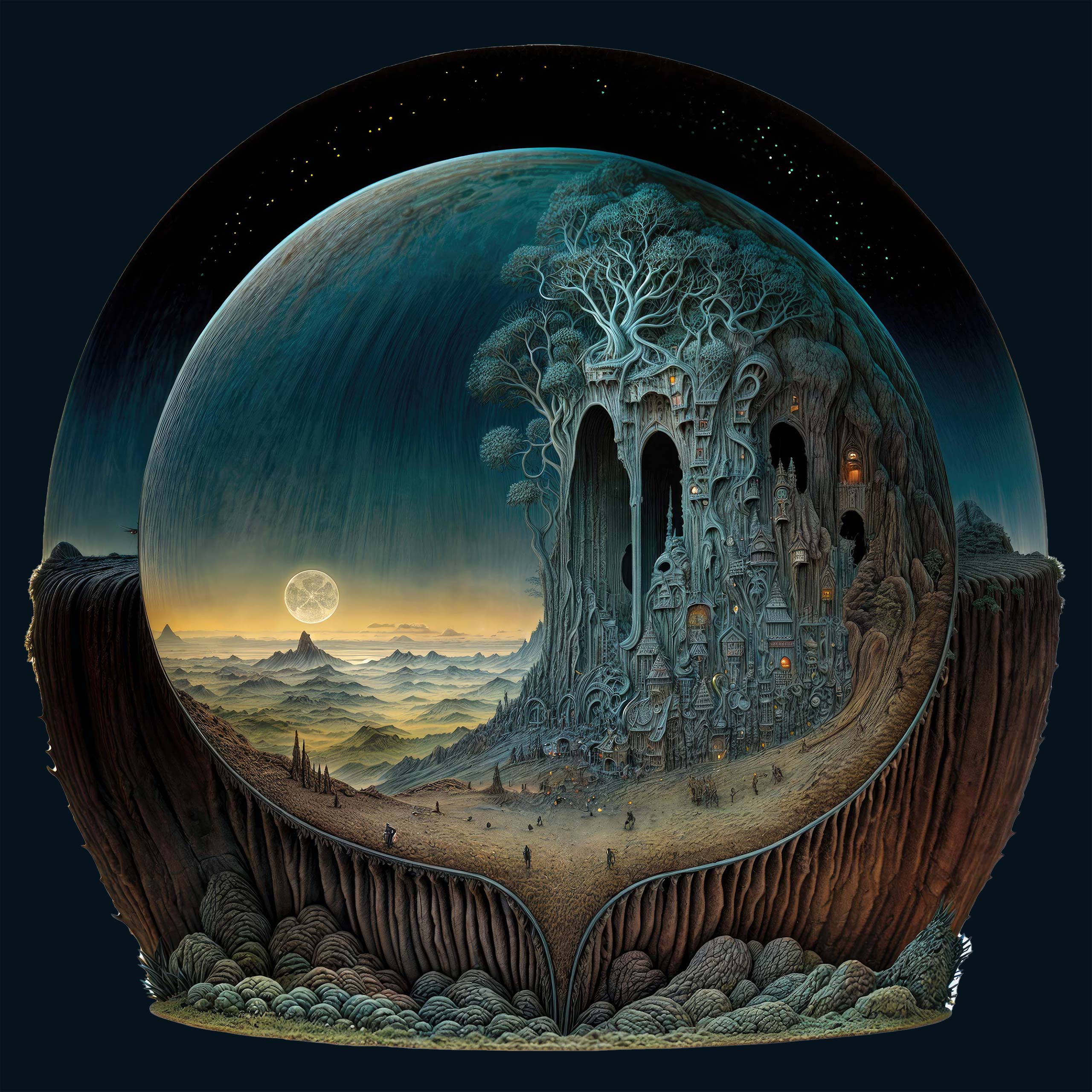 Welcome to “Petite Planets”, a collection of tiny universes encapsulated within orbs, presented in surreal, twisted cutaway views, meticulously sliced for your viewing pleasure. Immerse yourself in a spectrum of ecosystems and geographies, journeying through worlds sculpted by sand, forged in fire, frozen in ice, and flourishing with life. The artwork is part of Surreal 100 -series, celebrating 100 years of surrealism.