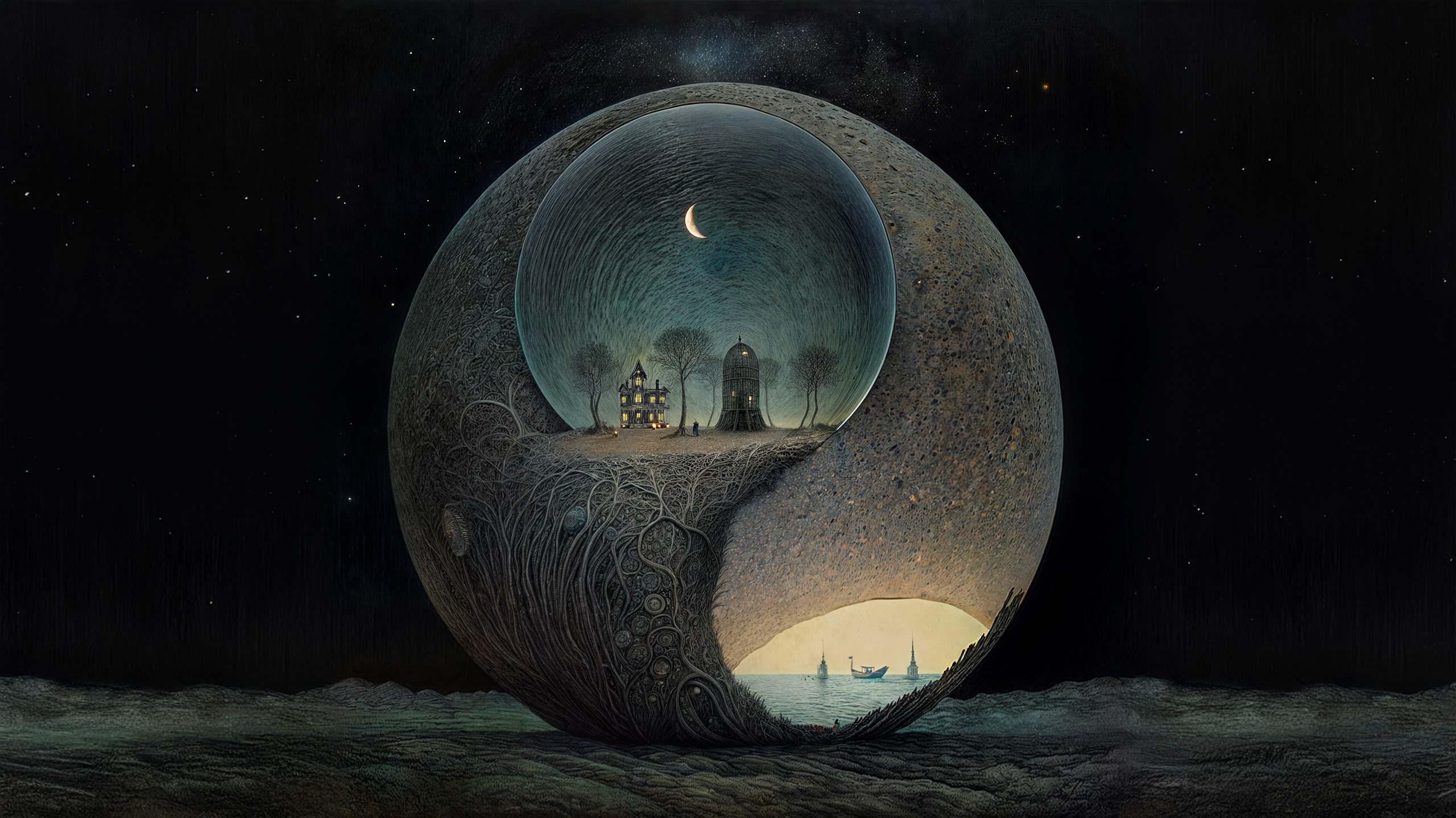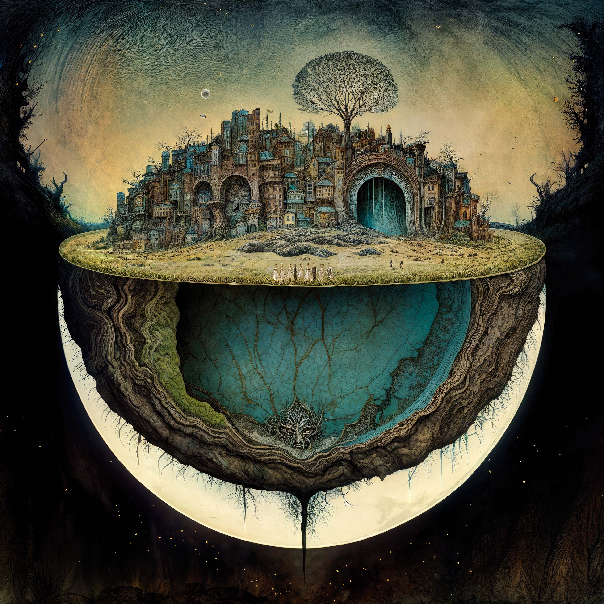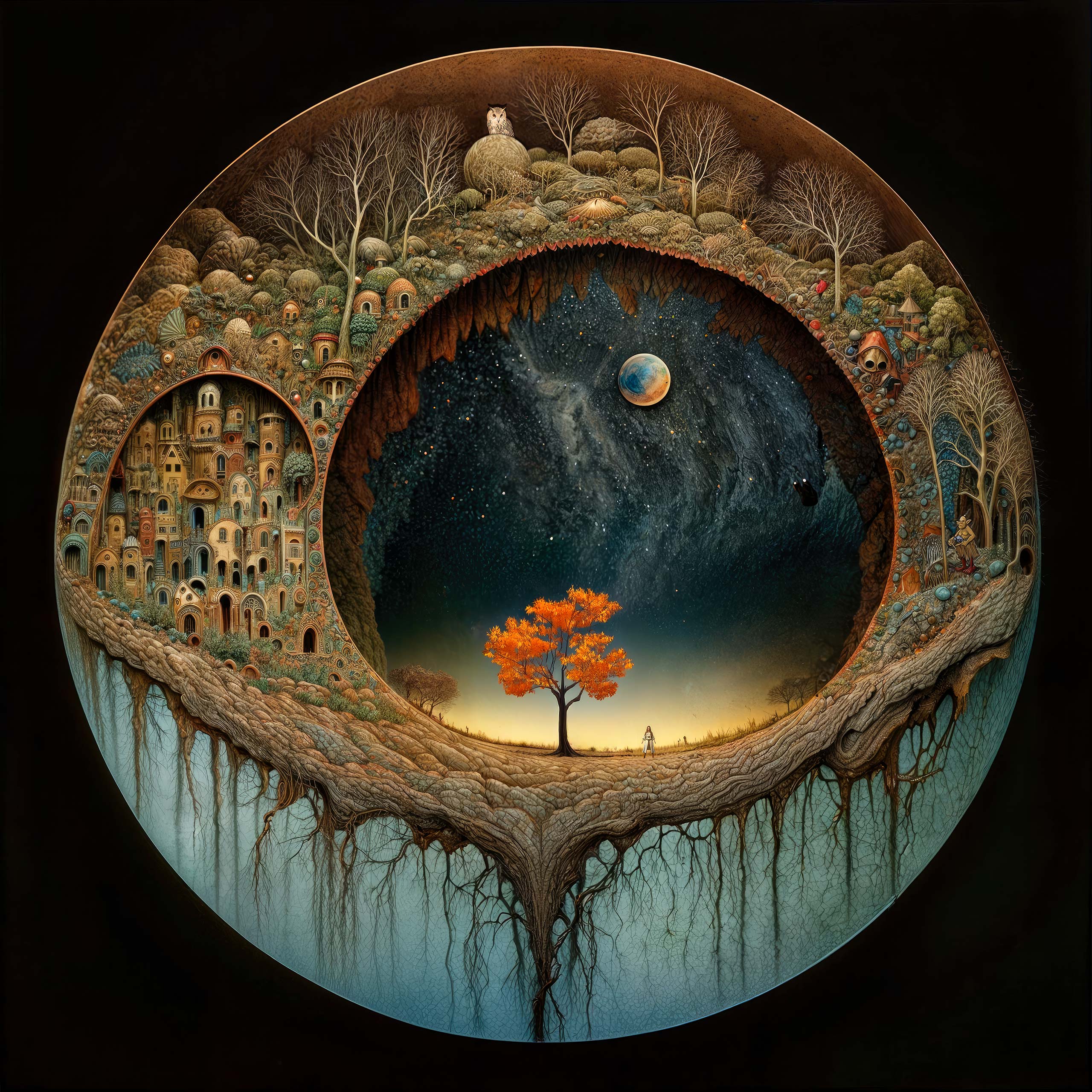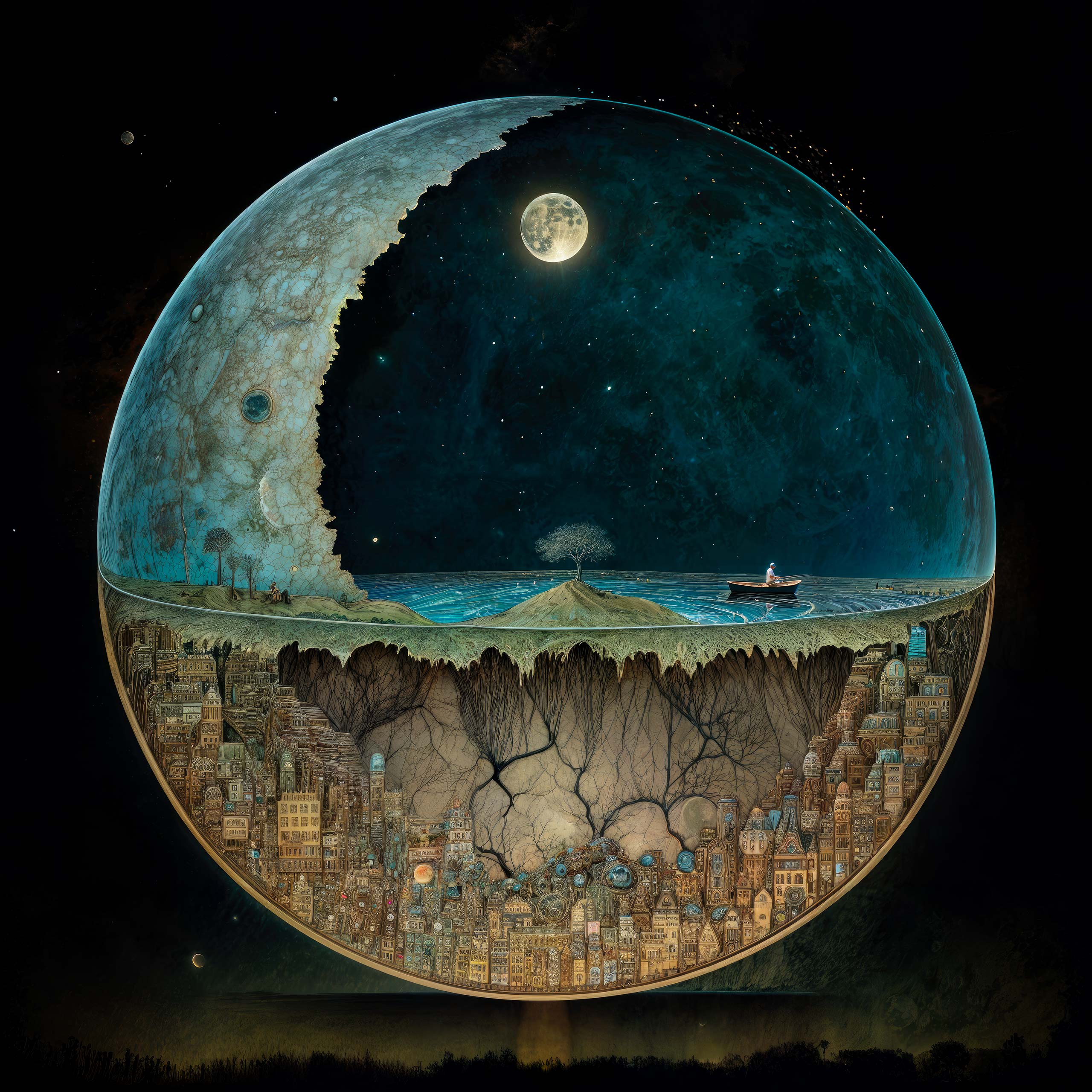 Welcome to “Petite Planets”, a collection of tiny universes encapsulated within orbs, presented in surreal, twisted cutaway views, meticulously sliced for your viewing pleasure. Immerse yourself in a spectrum of ecosystems and geographies, journeying through worlds sculpted by sand, forged in fire, frozen in ice, and flourishing with life. The artwork is part of Surreal 100 -series, celebrating 100 years of surrealism.