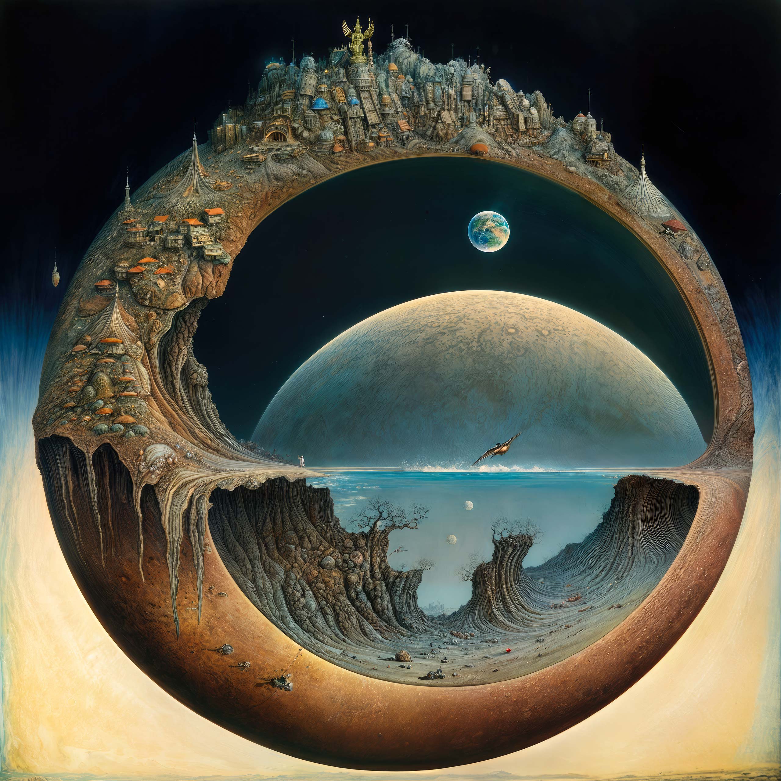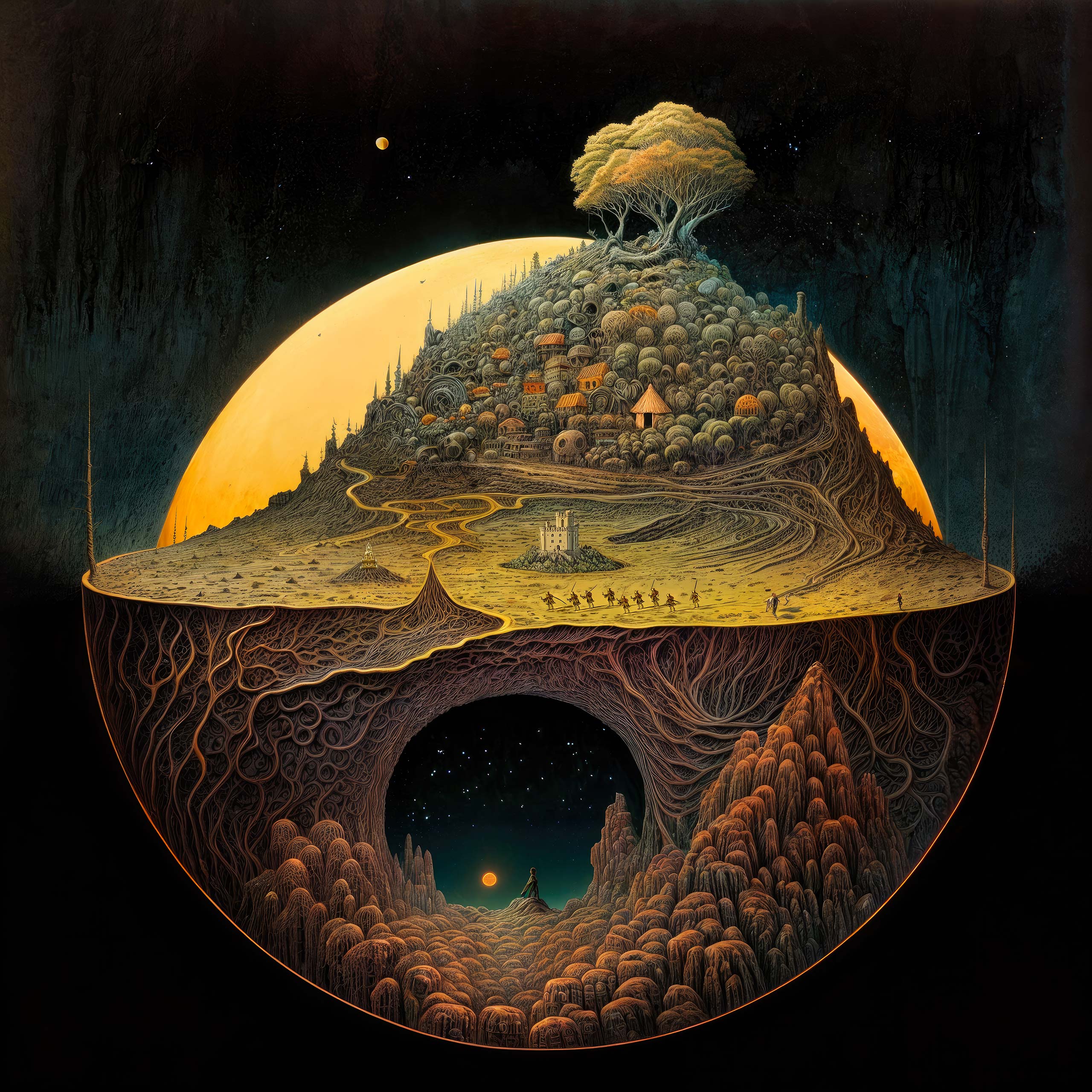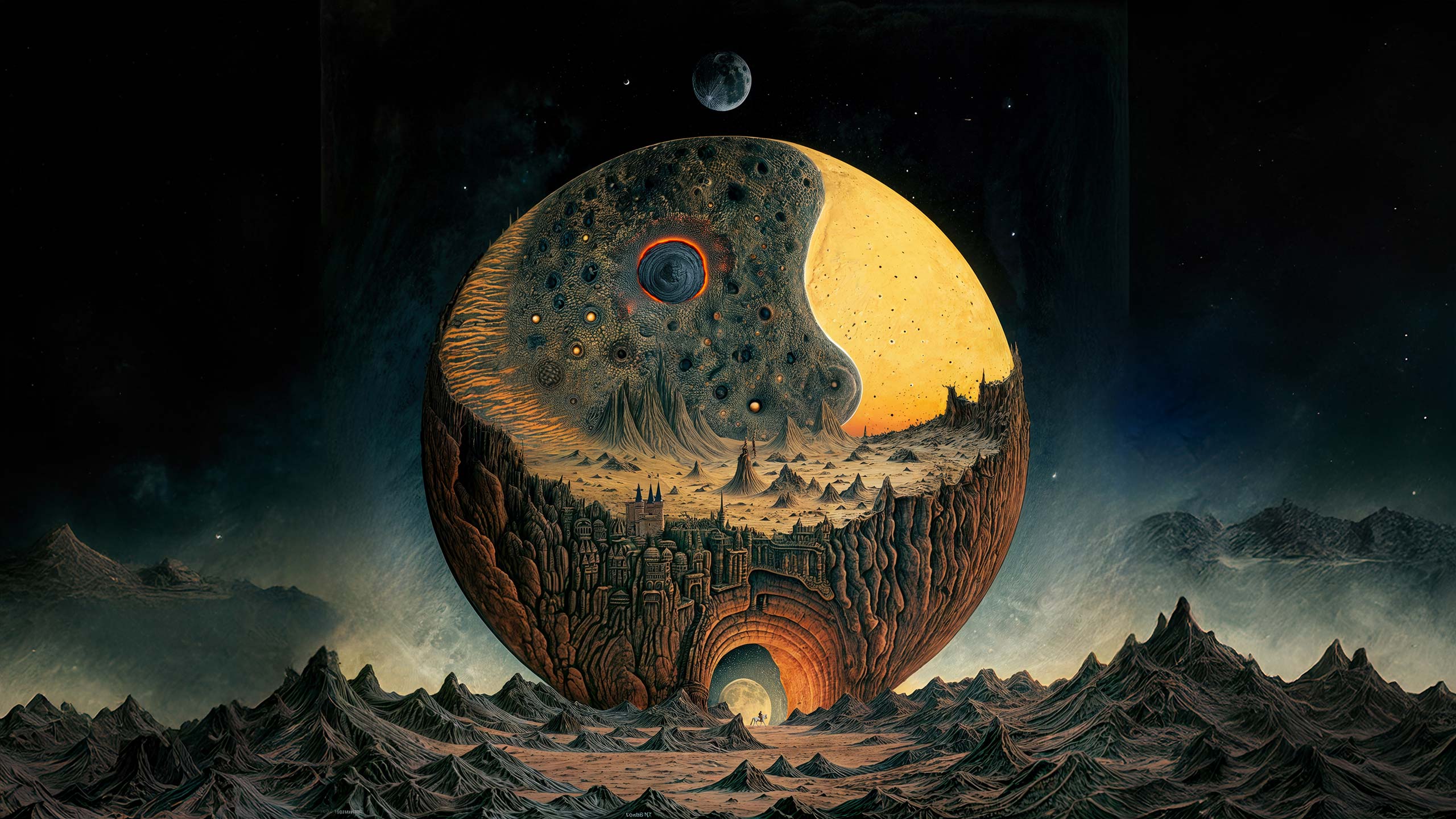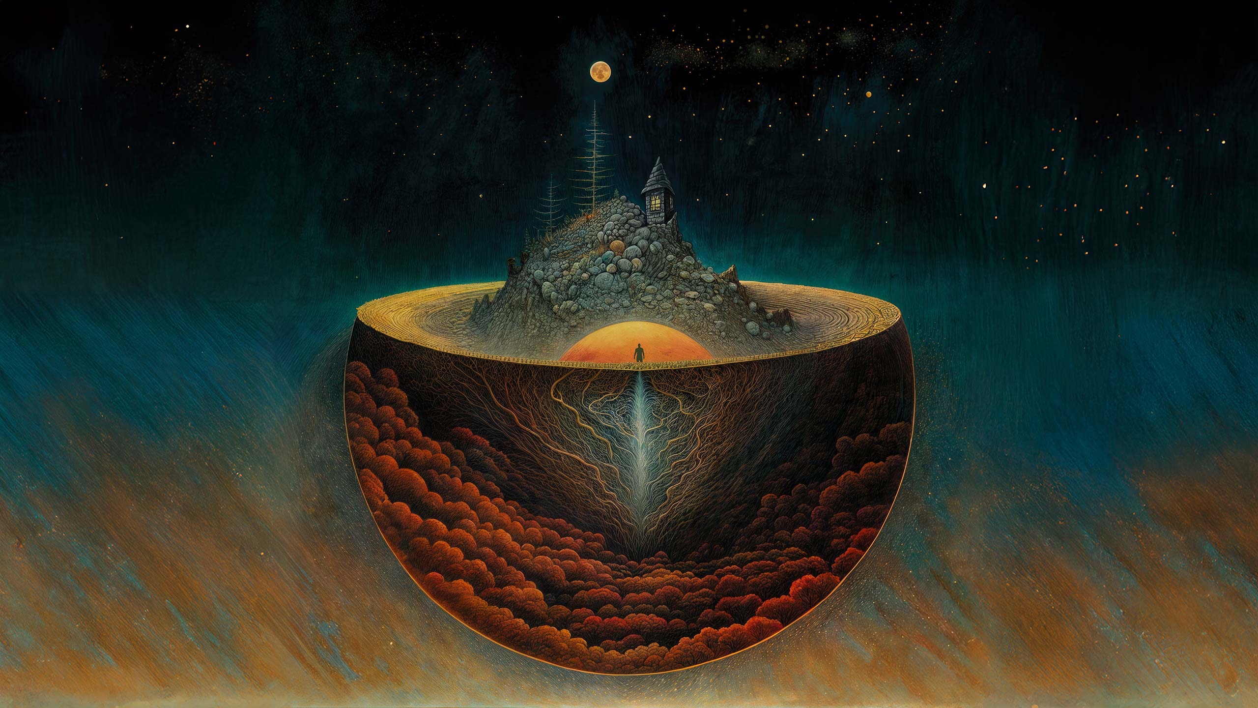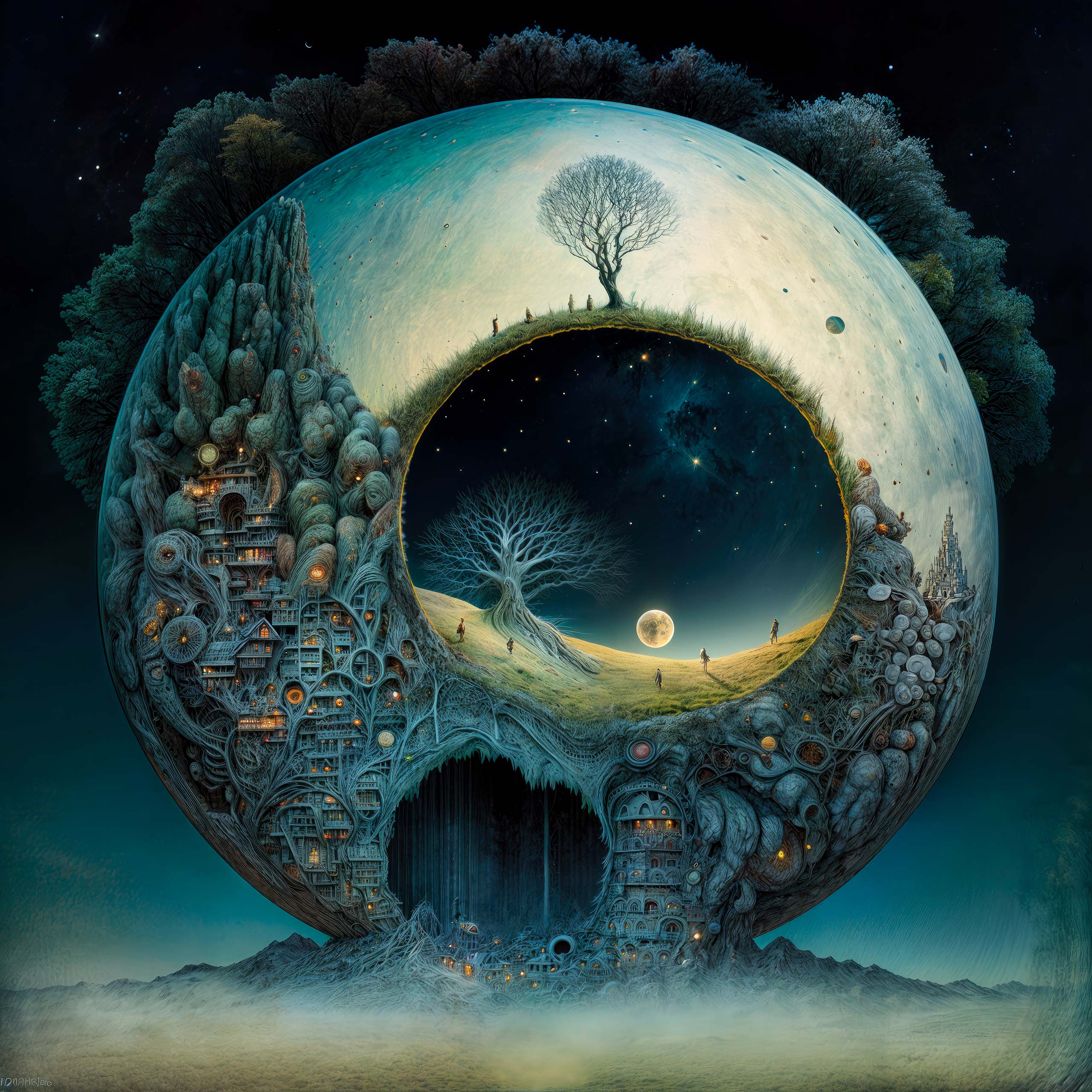 Welcome to “Petite Planets”, a collection of tiny universes encapsulated within orbs, presented in surreal, twisted cutaway views, meticulously sliced for your viewing pleasure. Immerse yourself in a spectrum of ecosystems and geographies, journeying through worlds sculpted by sand, forged in fire, frozen in ice, and flourishing with life. The artwork is part of Surreal 100 -series, celebrating 100 years of surrealism.