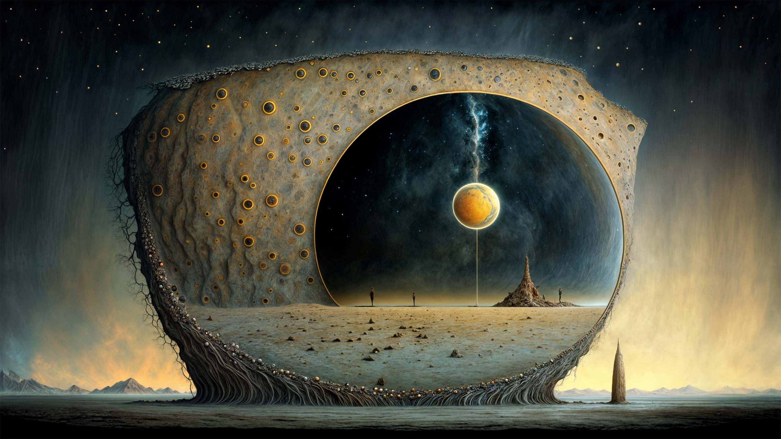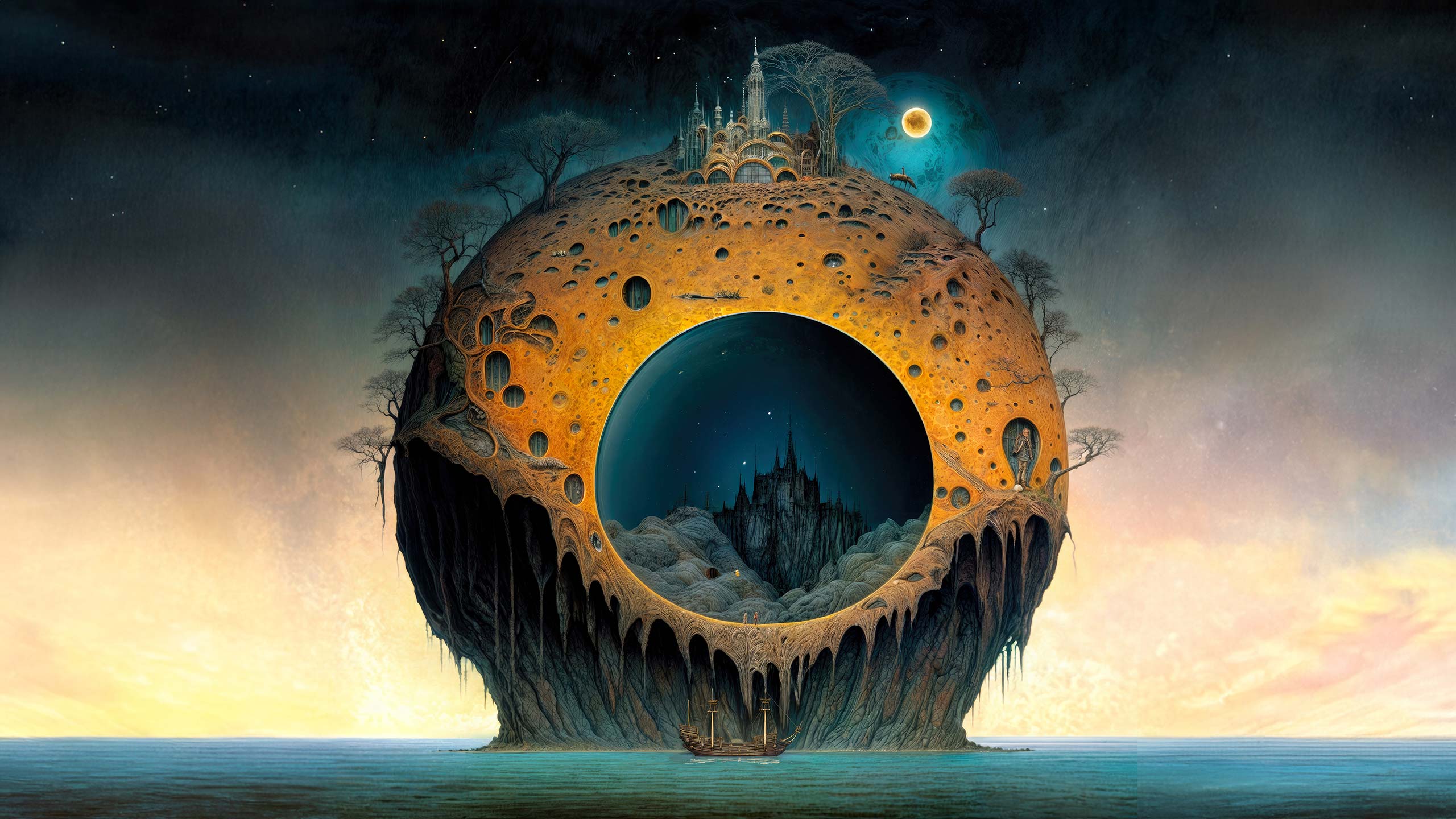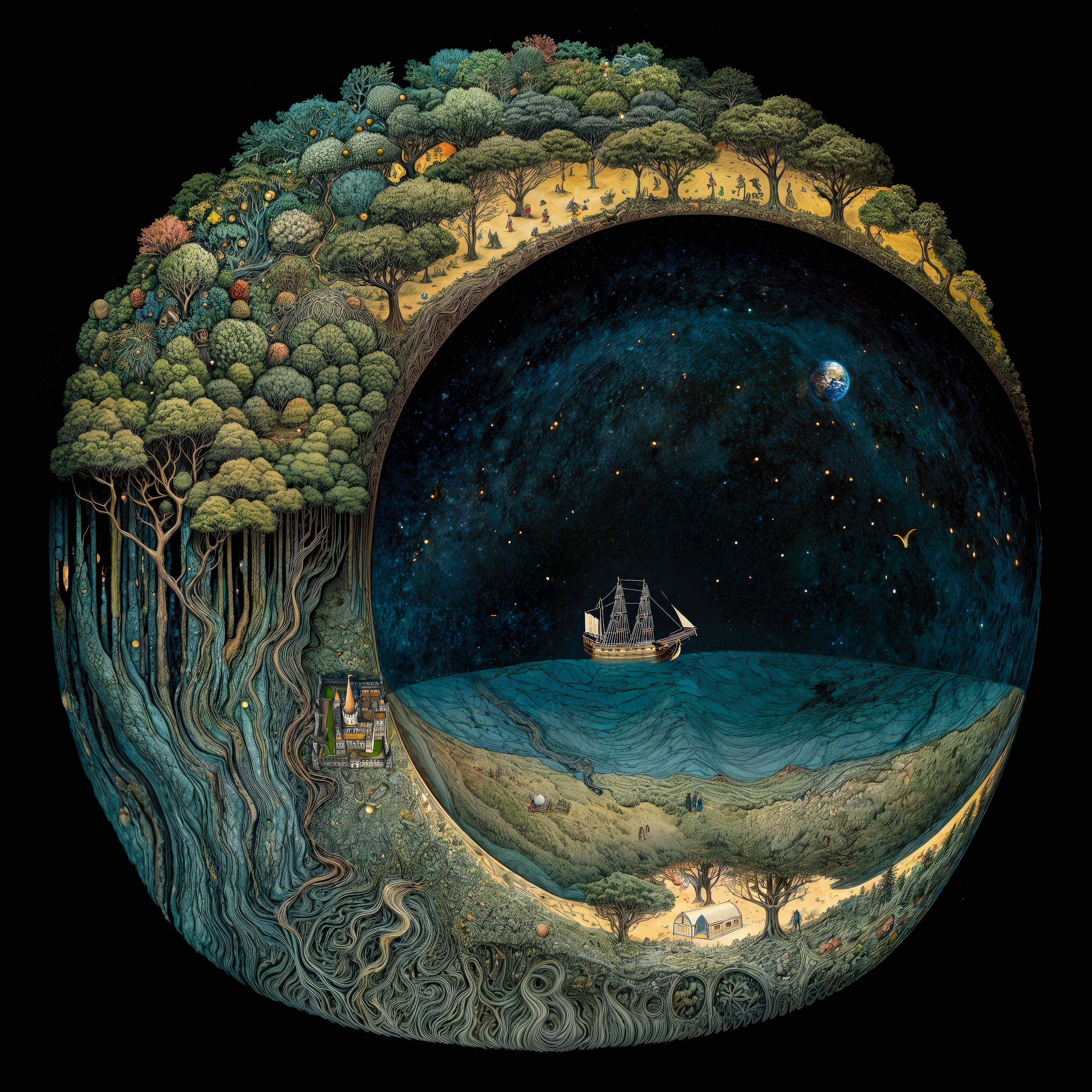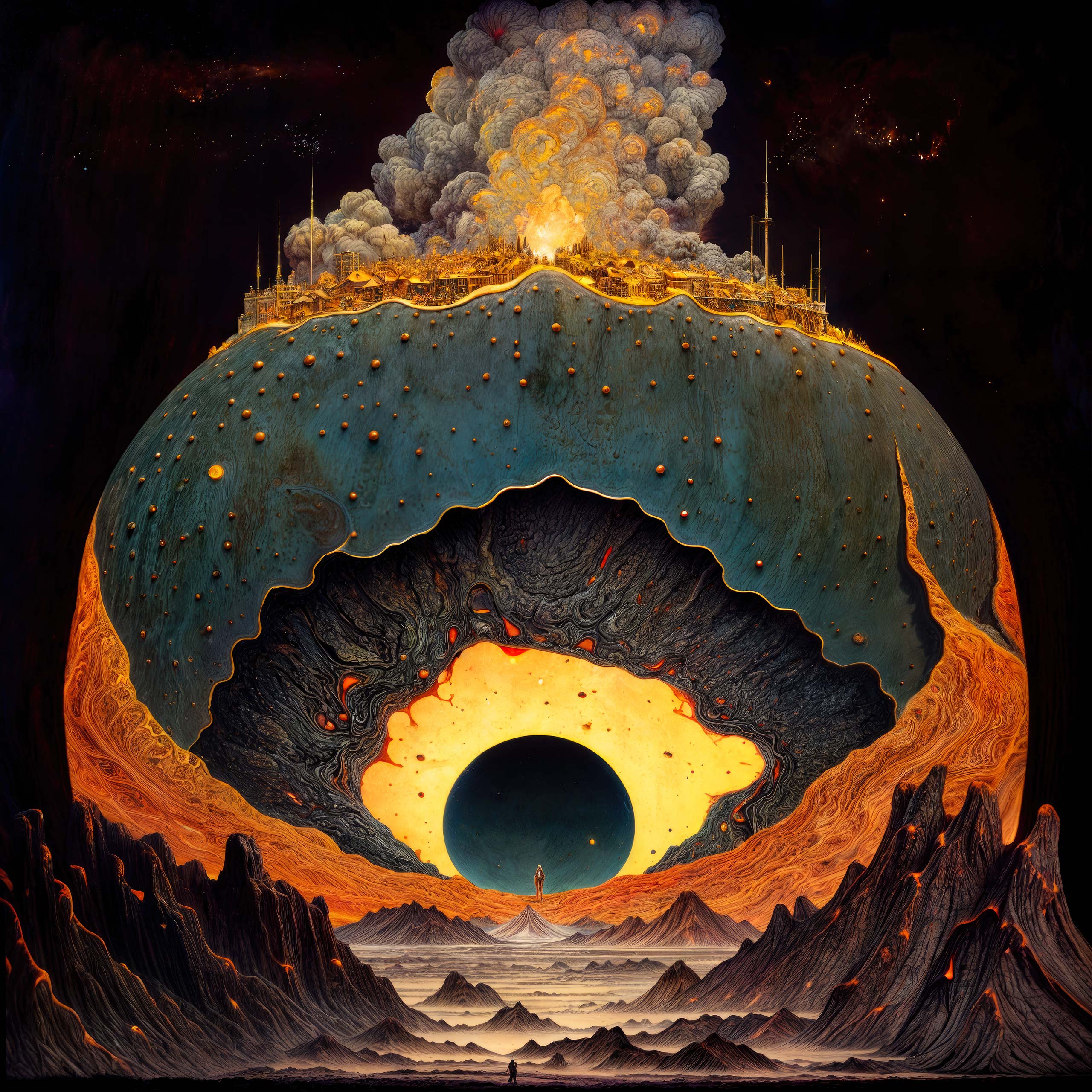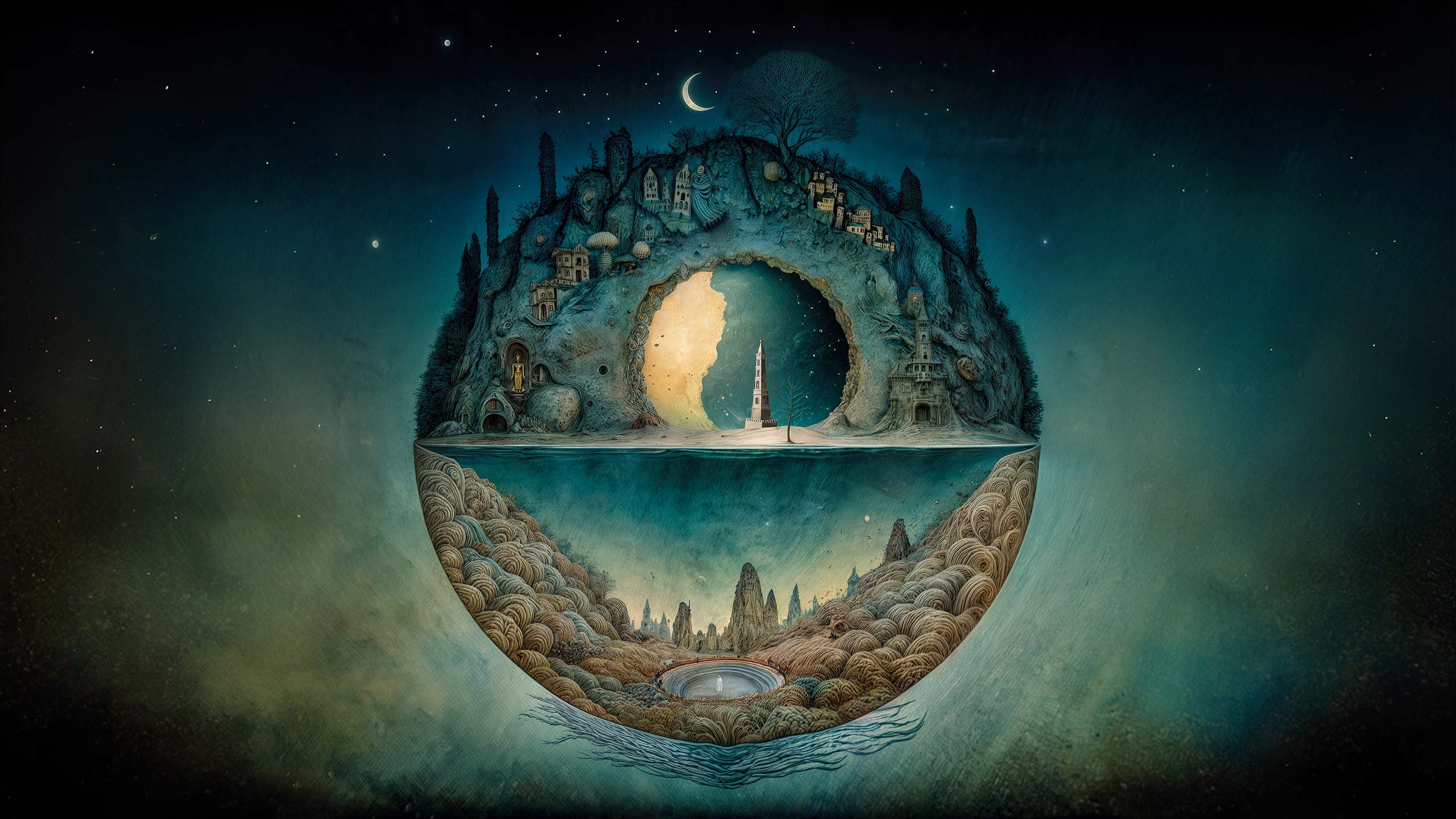 Welcome to “Petite Planets”, a collection of tiny universes encapsulated within orbs, presented in surreal, twisted cutaway views, meticulously sliced for your viewing pleasure. Immerse yourself in a spectrum of ecosystems and geographies, journeying through worlds sculpted by sand, forged in fire, frozen in ice, and flourishing with life. The artwork is part of Surreal 100 -series, celebrating 100 years of surrealism.