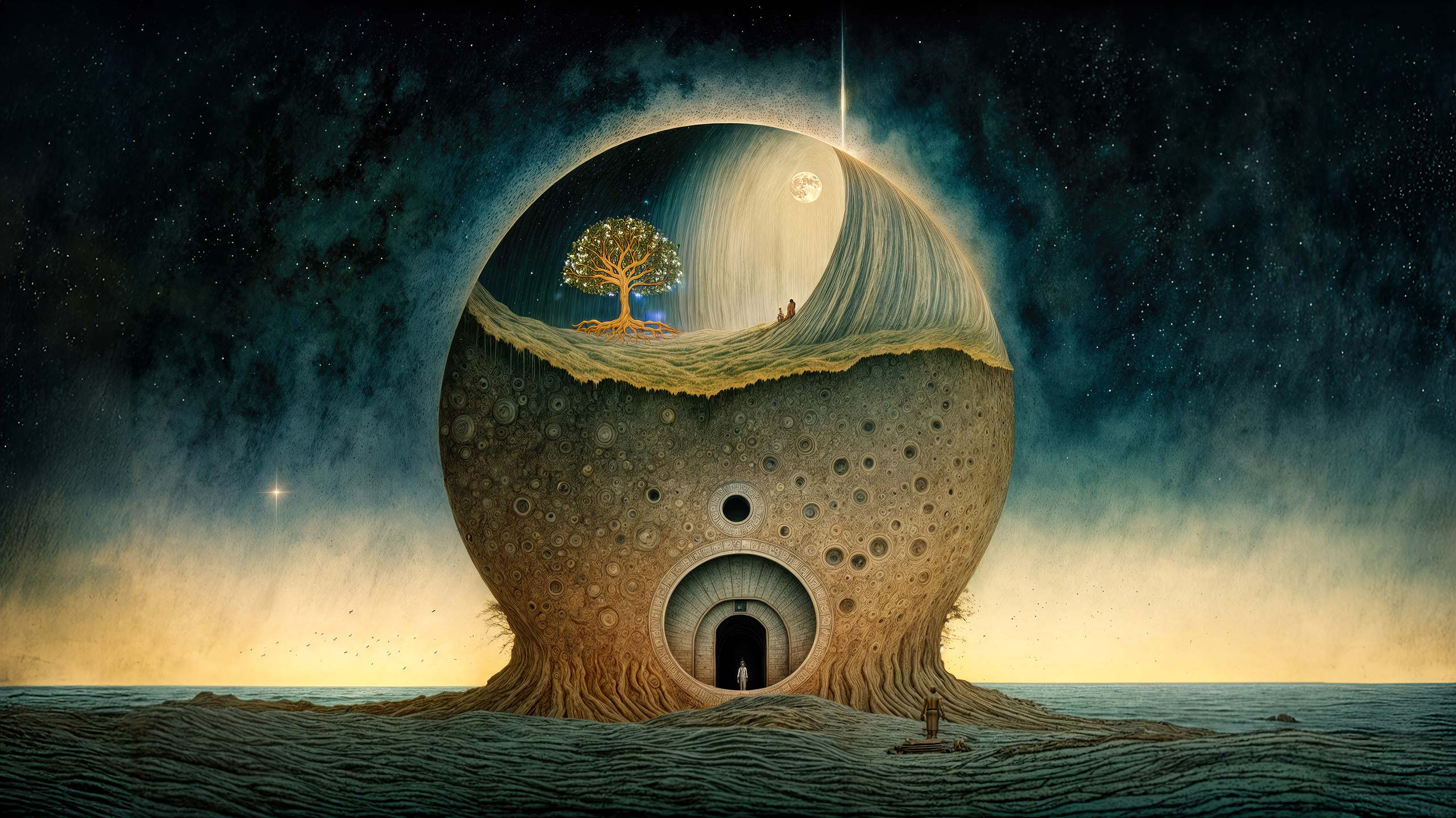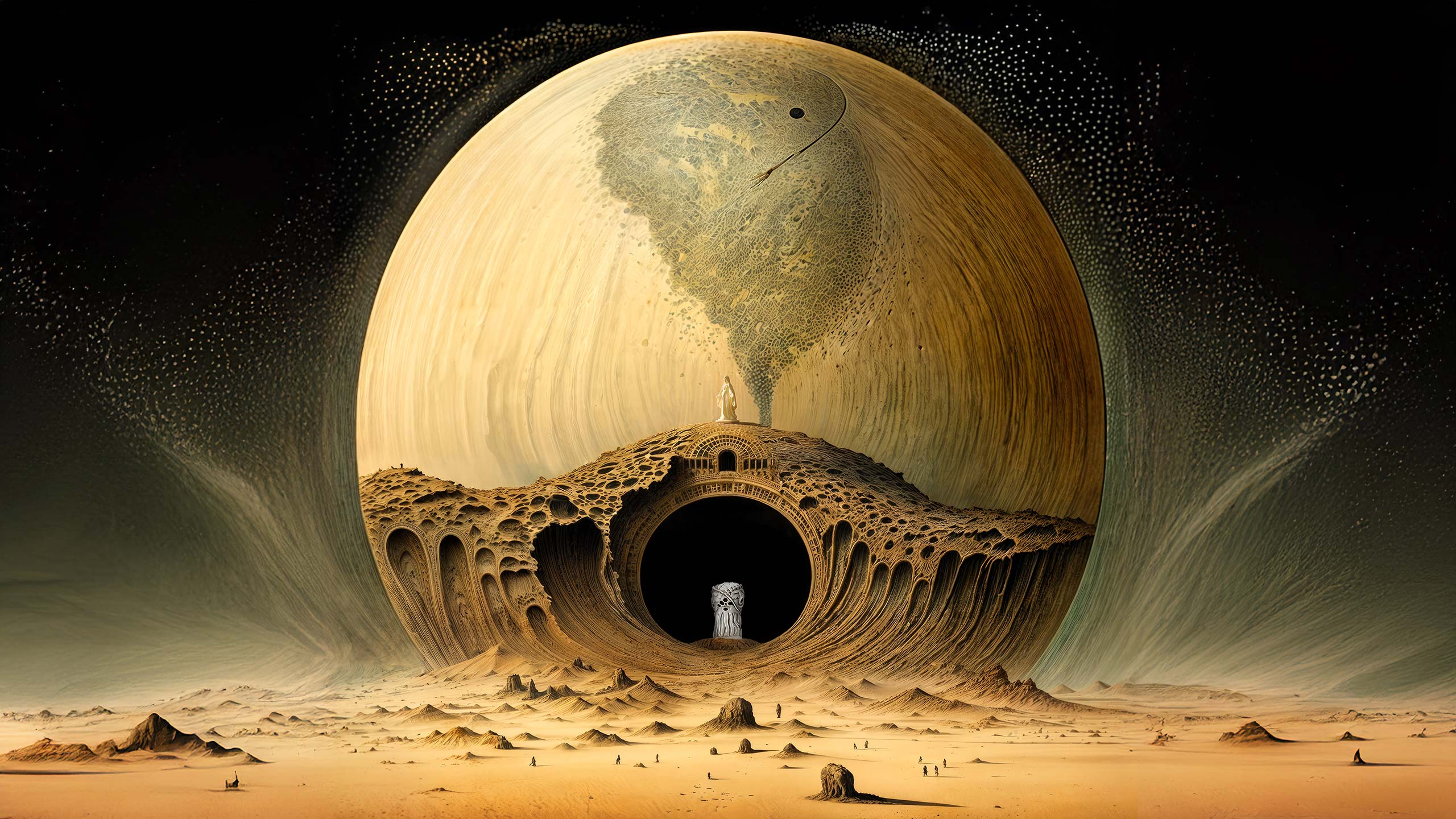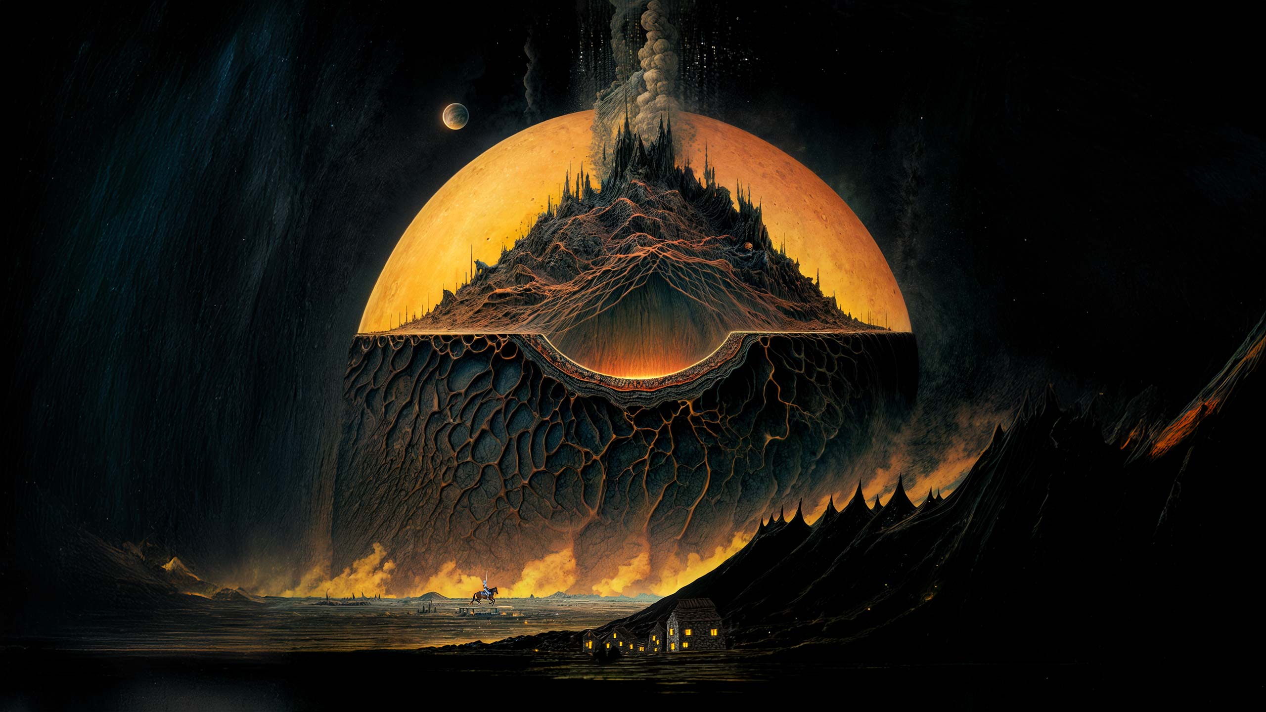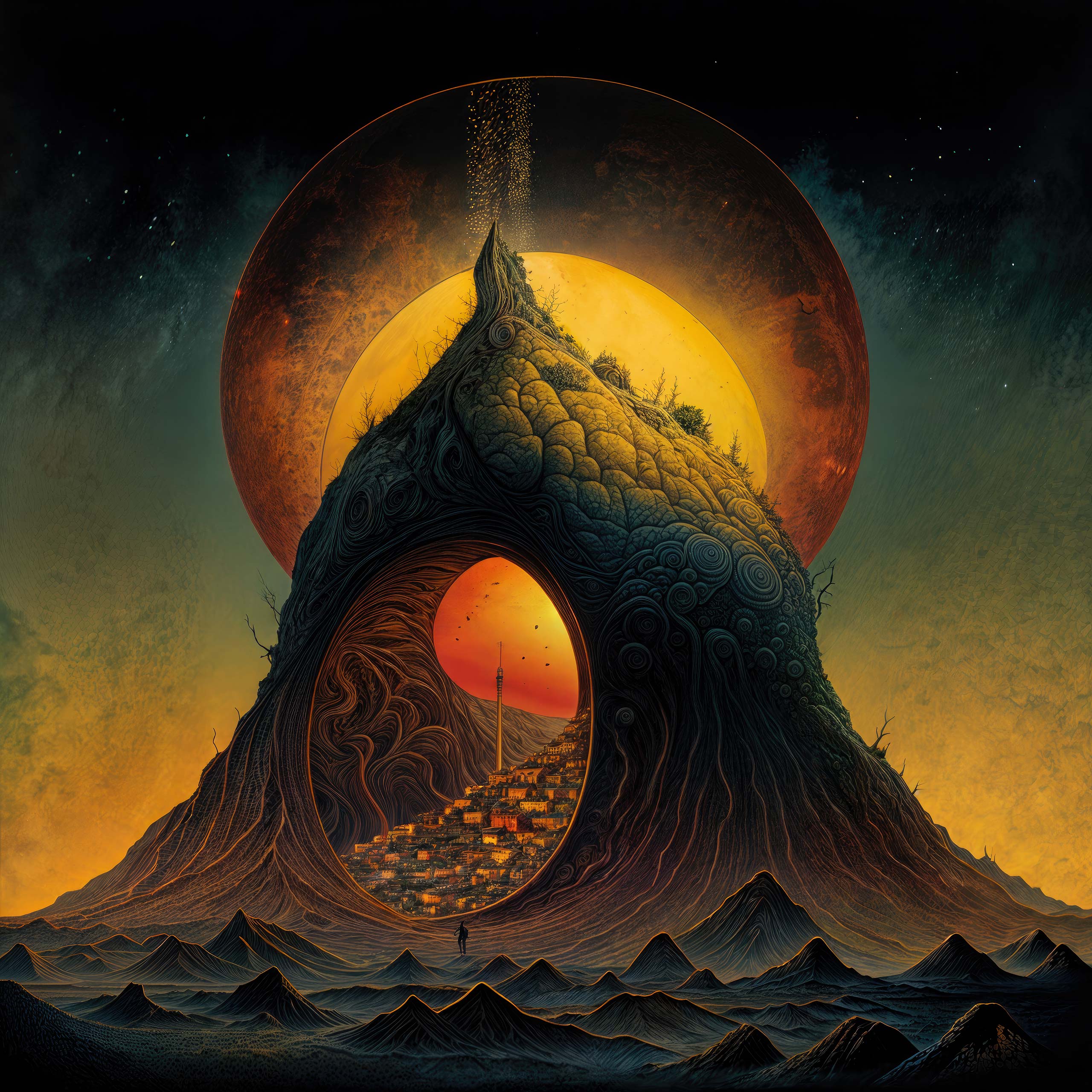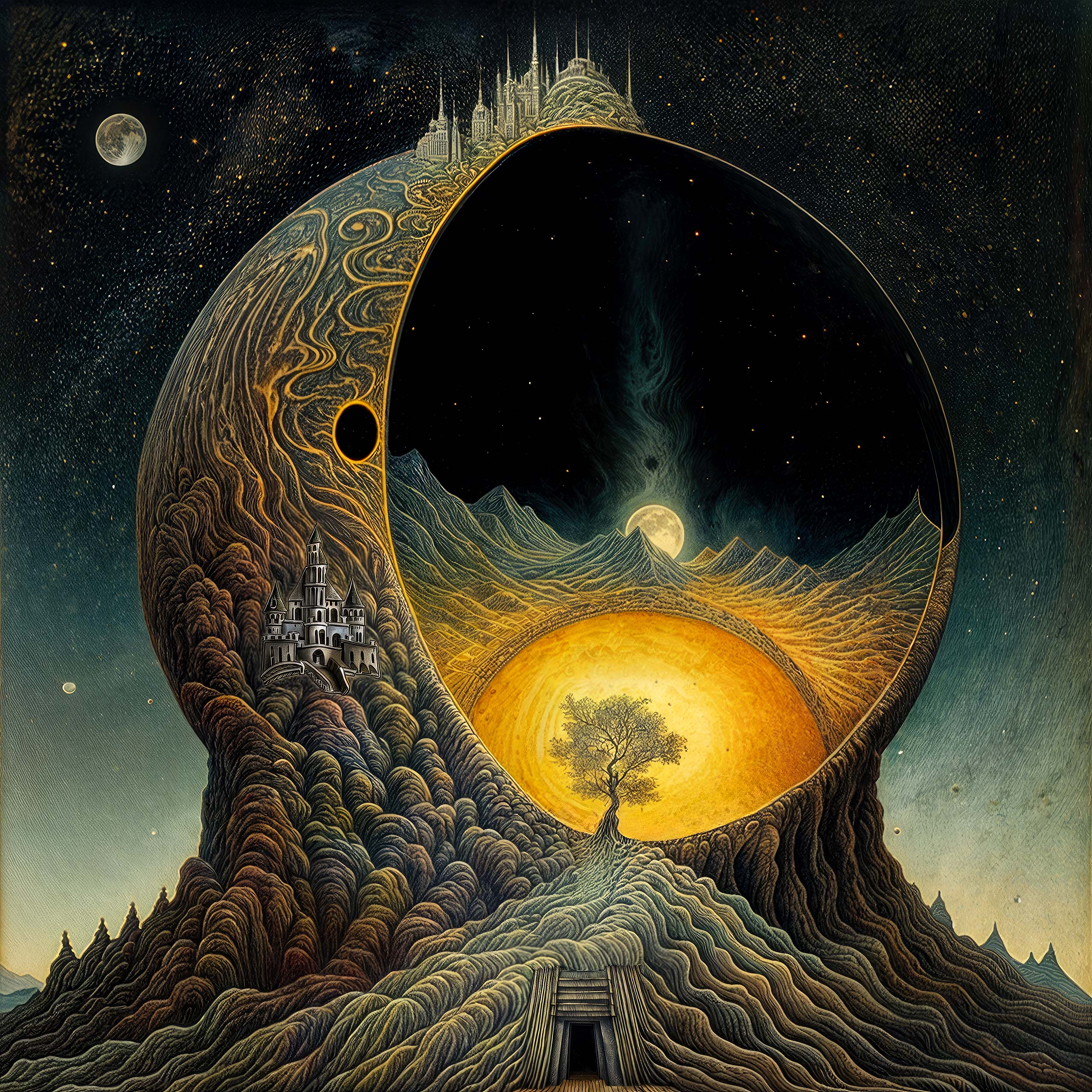 Welcome to “Petite Planets”, a collection of tiny universes encapsulated within orbs, presented in surreal, twisted cutaway views, meticulously sliced for your viewing pleasure. Immerse yourself in a spectrum of ecosystems and geographies, journeying through worlds sculpted by sand, forged in fire, frozen in ice, and flourishing with life. The artwork is part of Surreal 100 -series, celebrating 100 years of surrealism.