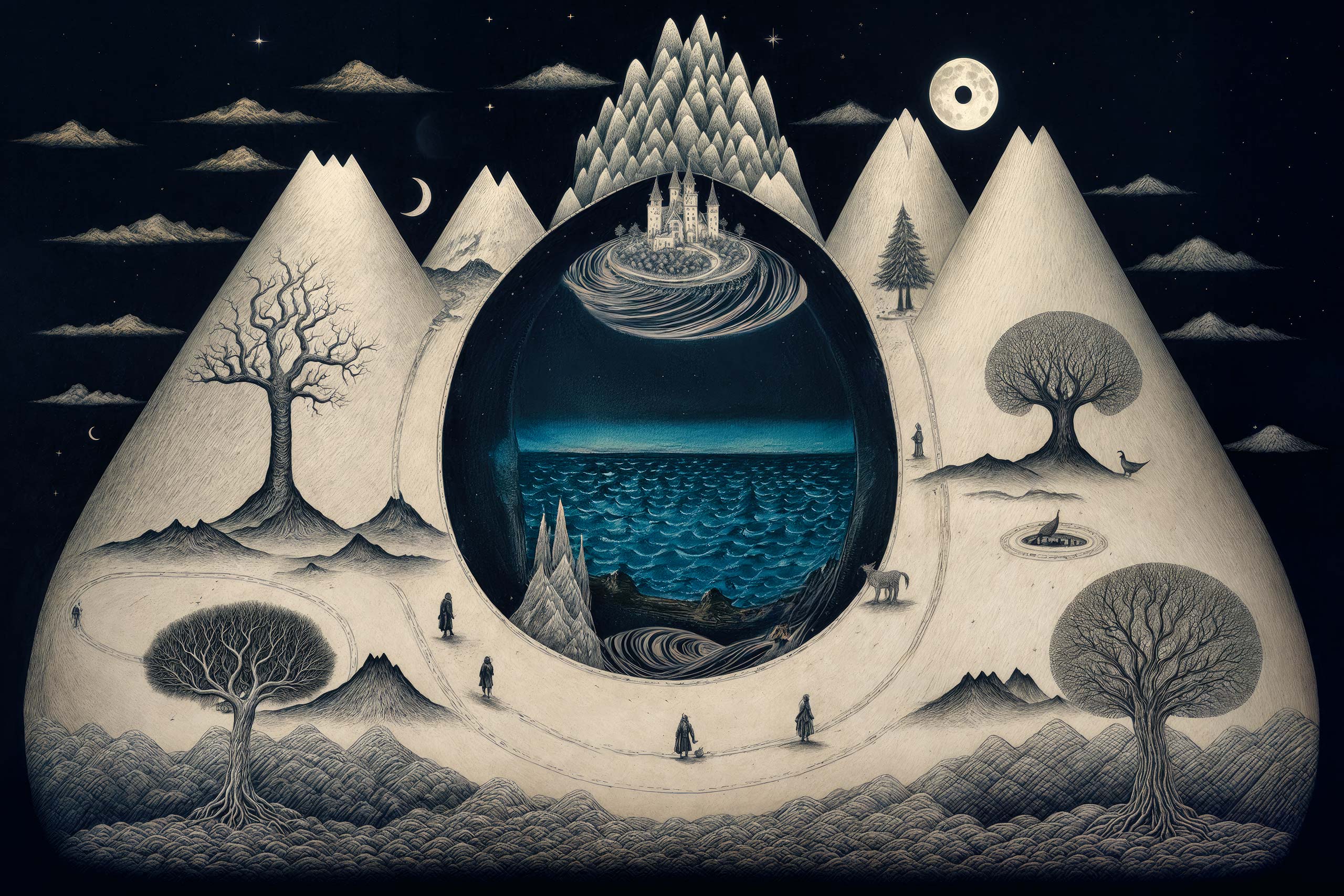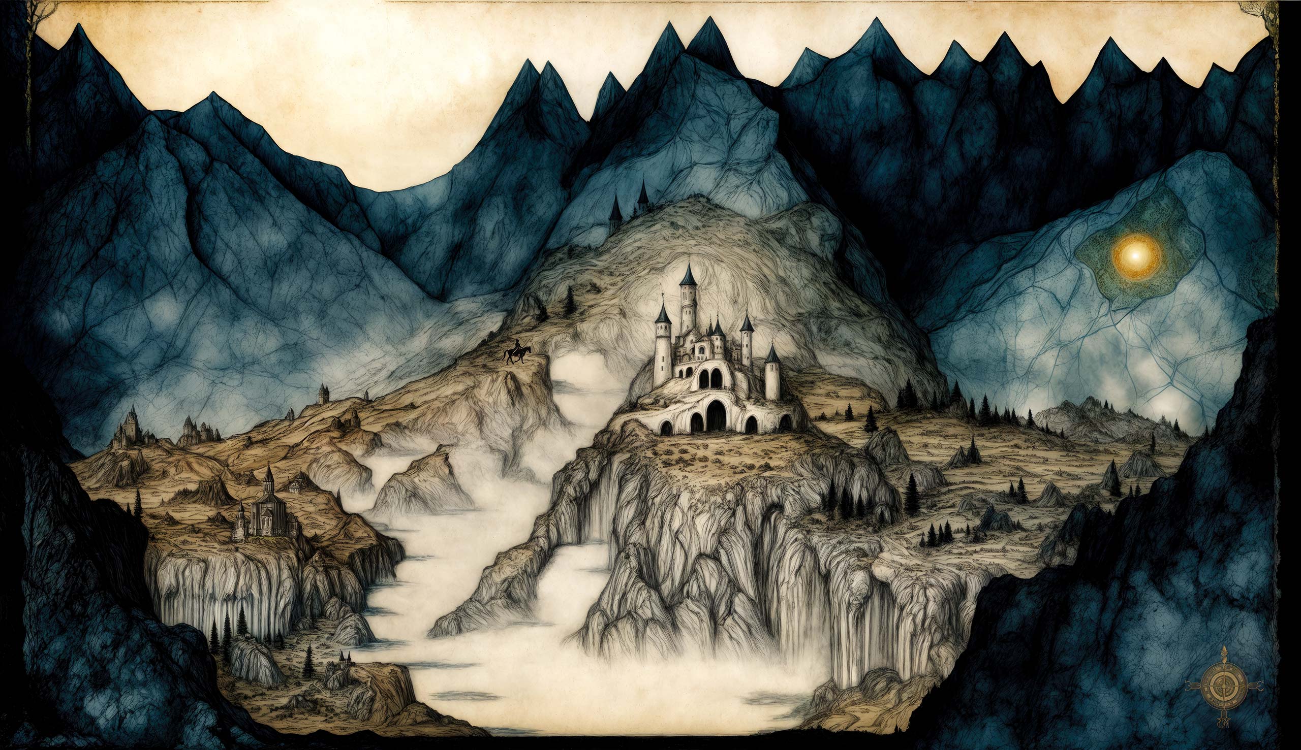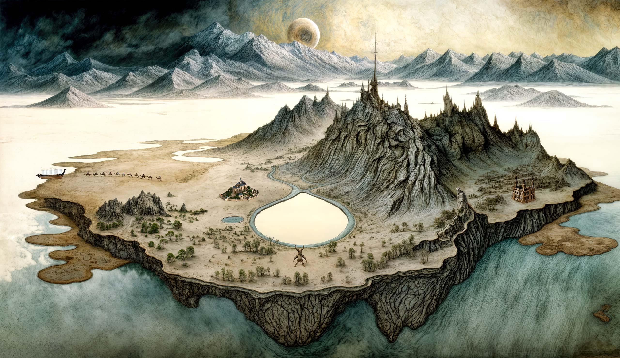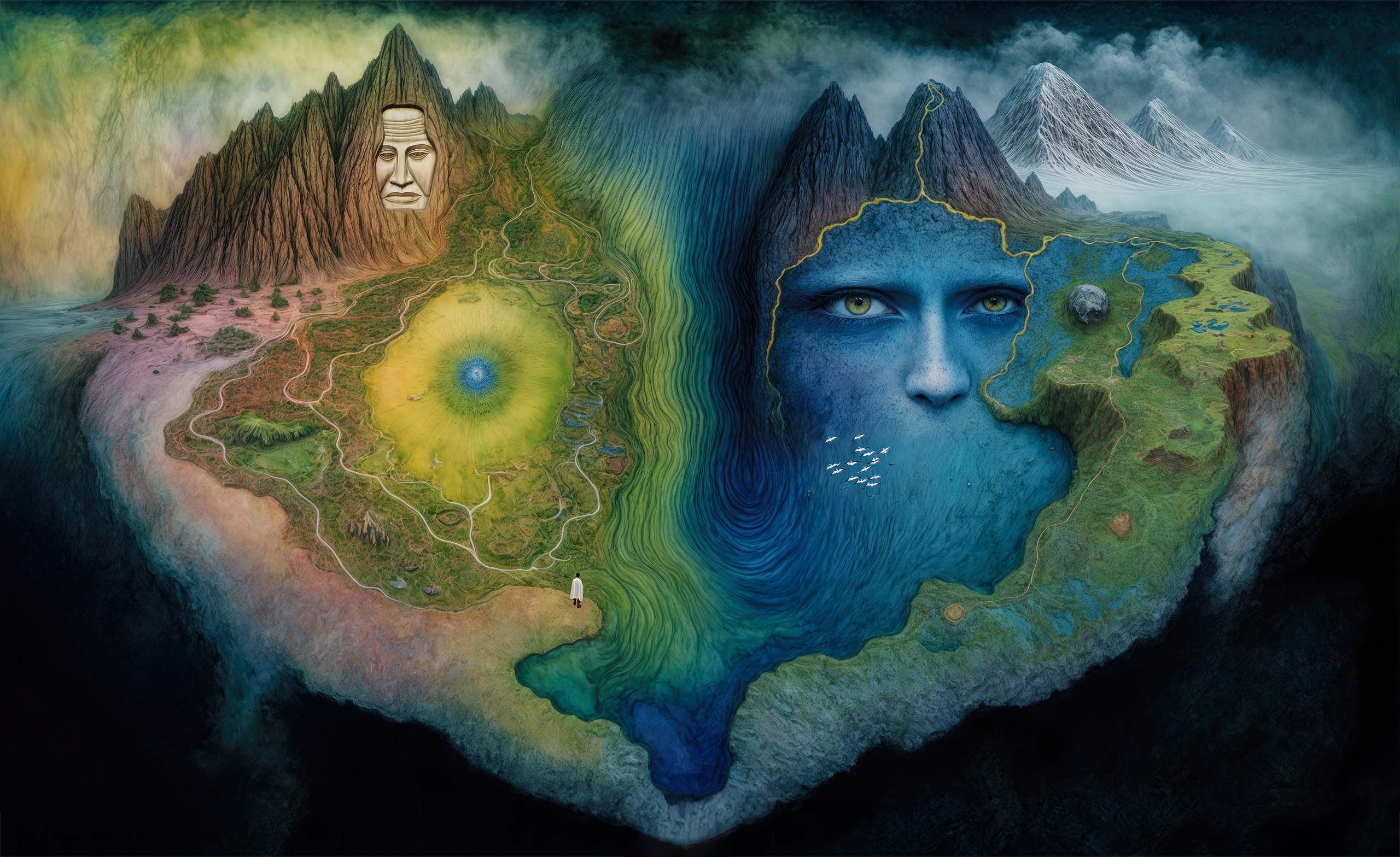 “Terra Incognita” maps out the great unknown, piece by piece, bringing to life the tales and myths of far-off places, capturing the archaic imagination of our ancestors. This series of highly detailed maps and cartographics is inspired by the legends of the Vikings, Celts, Ancient American civilizations, and beyond. Furthermore, the piece delves into the aesthetics of mapmaking, transitioning between 2D sketches, immersive 3D worlds, and venturing into impossibly twisted topographies. Many of these maps blend the art of landscape painting with the craft of cartography, incorporating symbolic markings and elements of navigation, exaggerating key features and sometimes reaching into the surreal.
