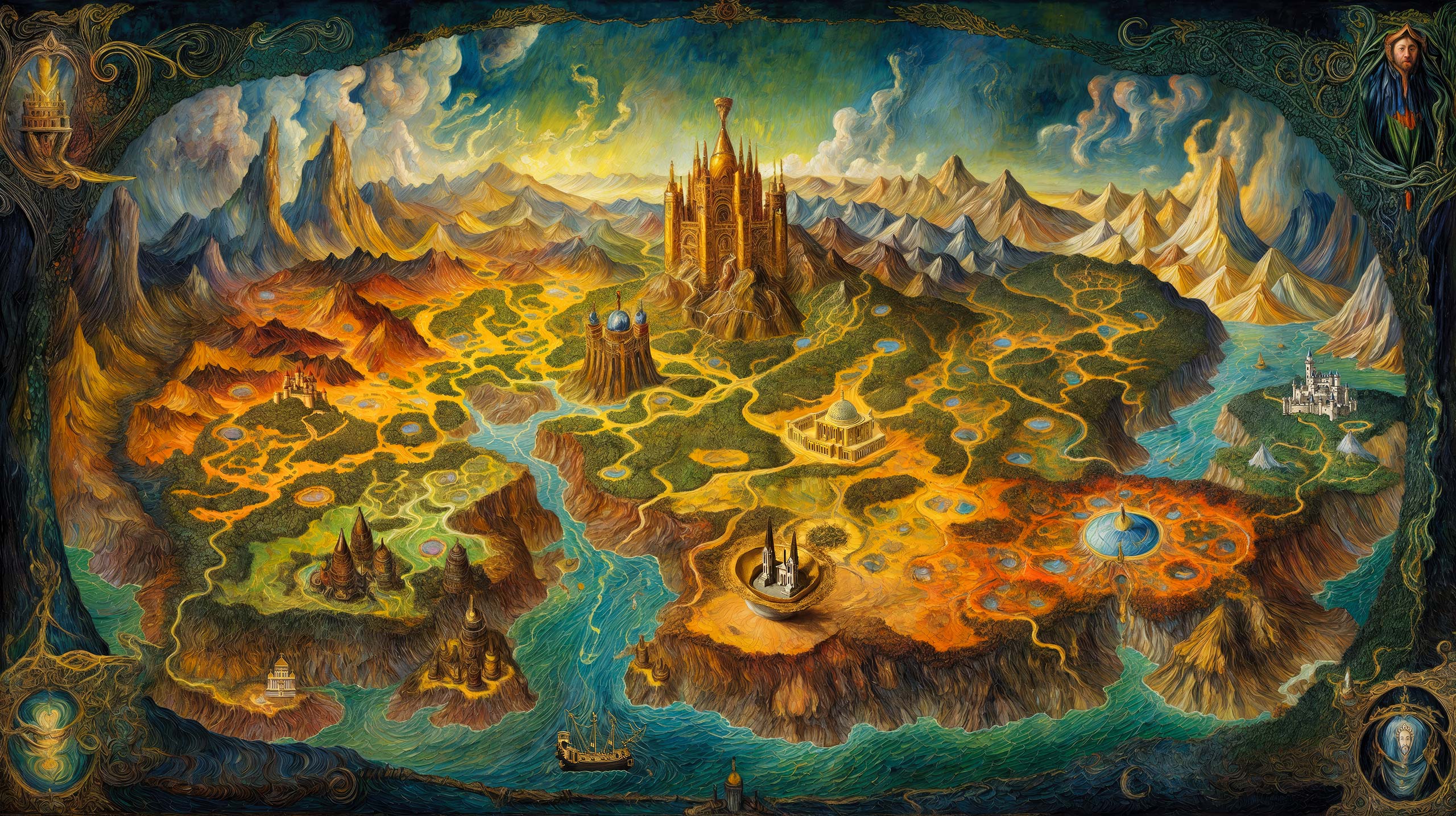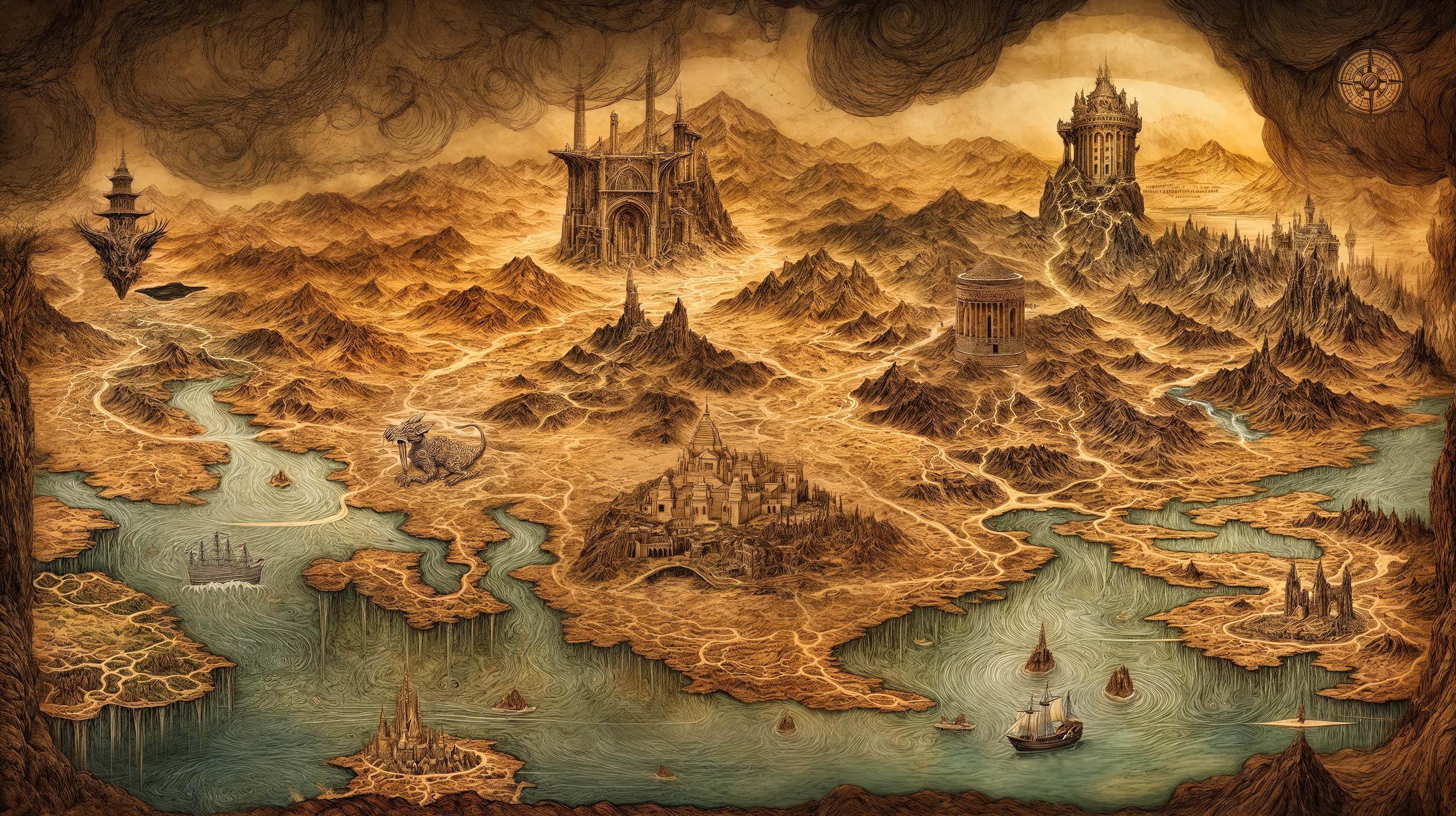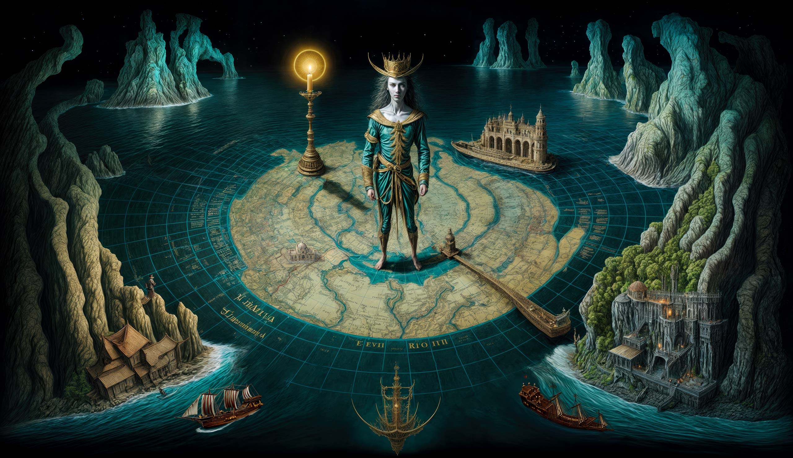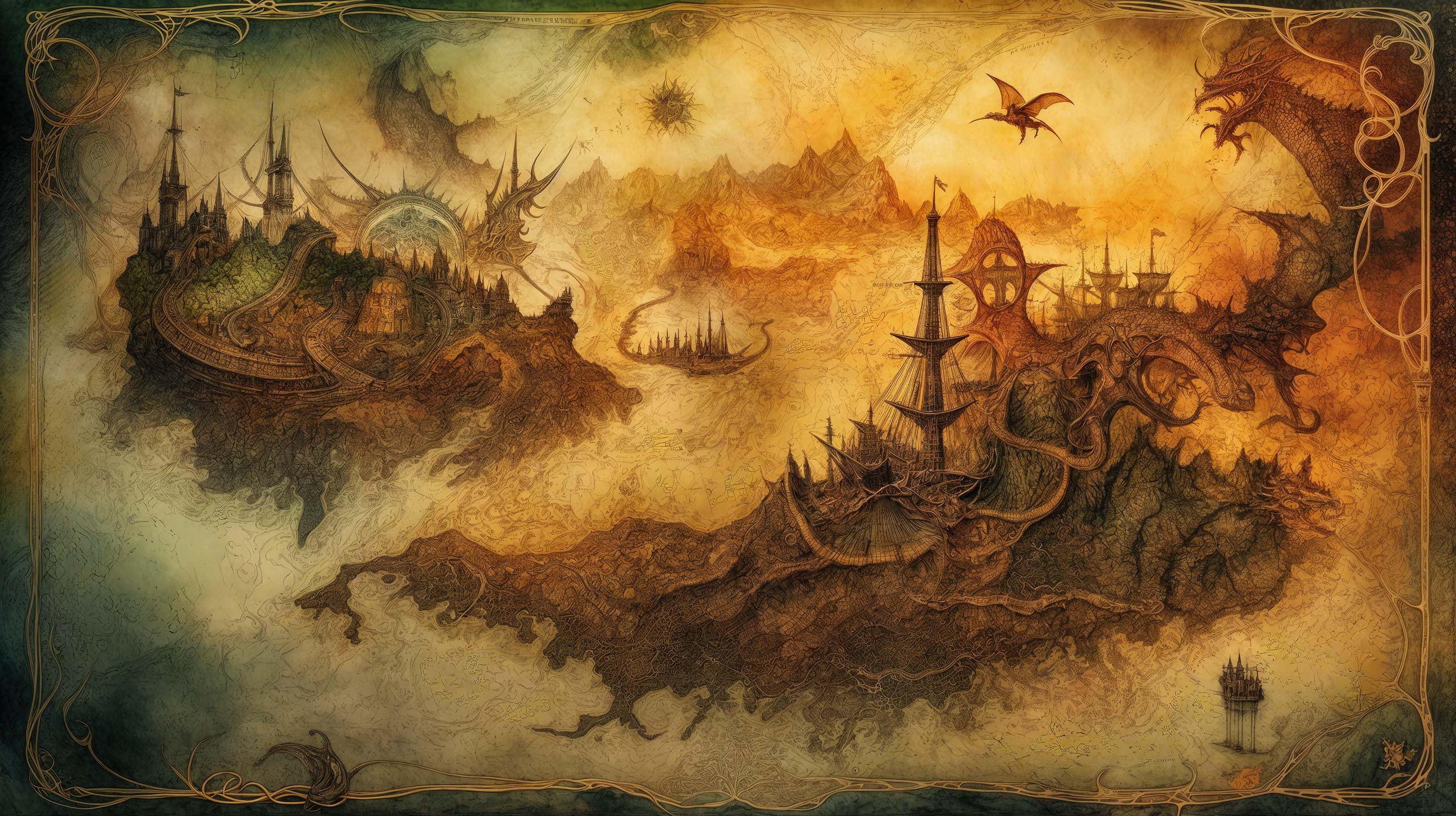 “Terra Incognita” embraces this sense of mystery, revealing unexplored lands brimming with imagination, rooted in ancient myths and folklore. These maps depict unknown territories beyond the seas, pieced together from fragmented memories, legendary tales, and the accounts of a few daring explorers. Each map, both ancient and symbolic, is a canvas of cryptic riddles yearning to be solved. Hidden pathways and intricate mazes lie in wait, promising untold treasures to those who dare to explore.