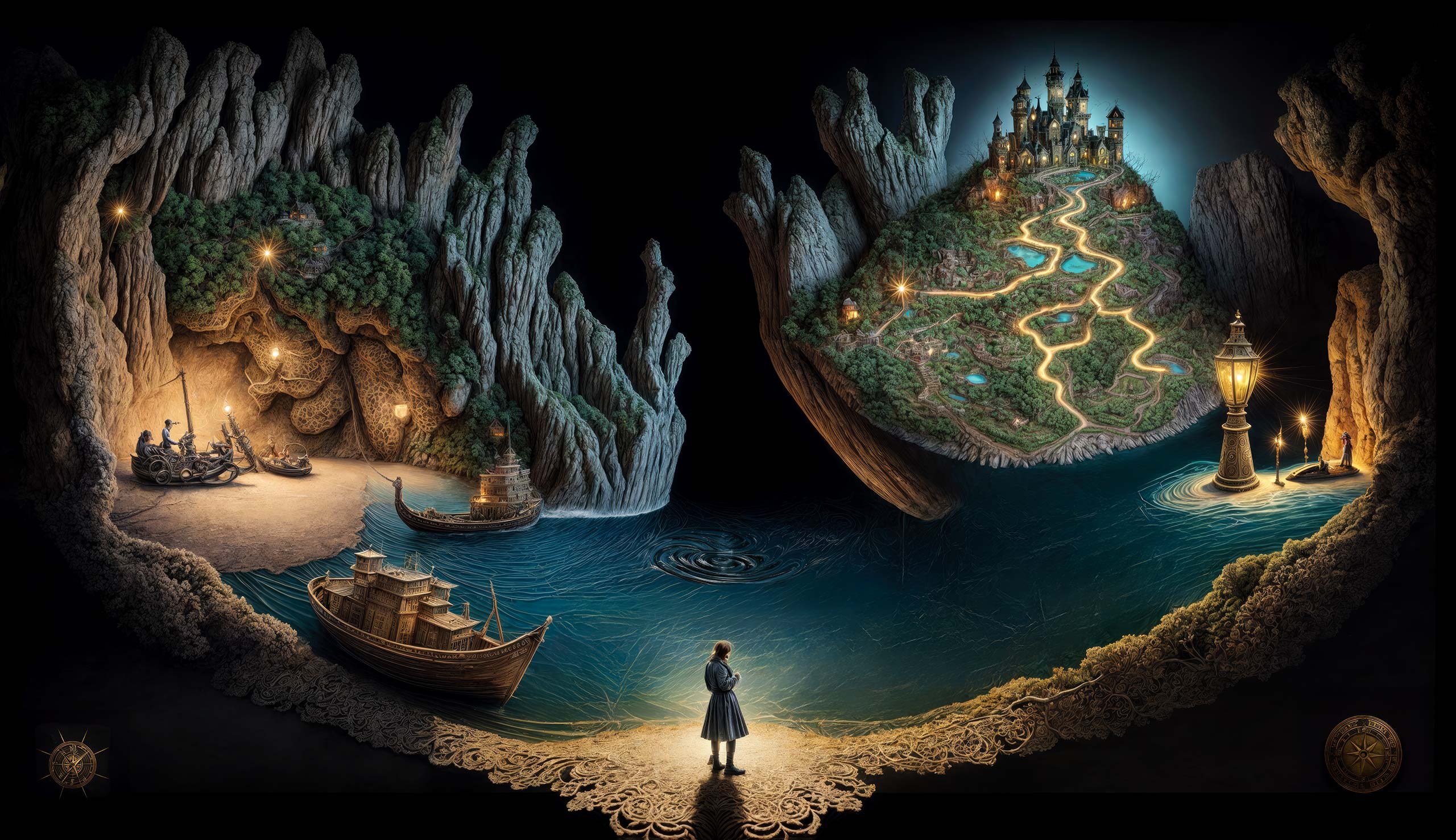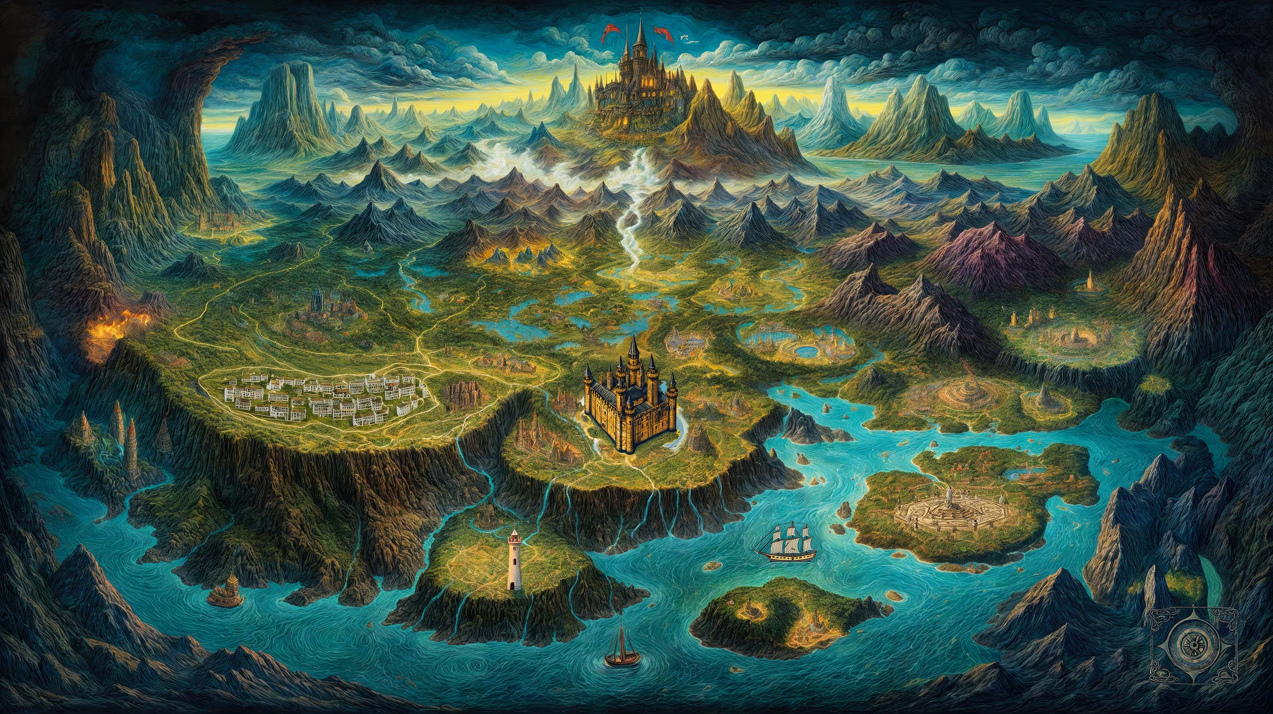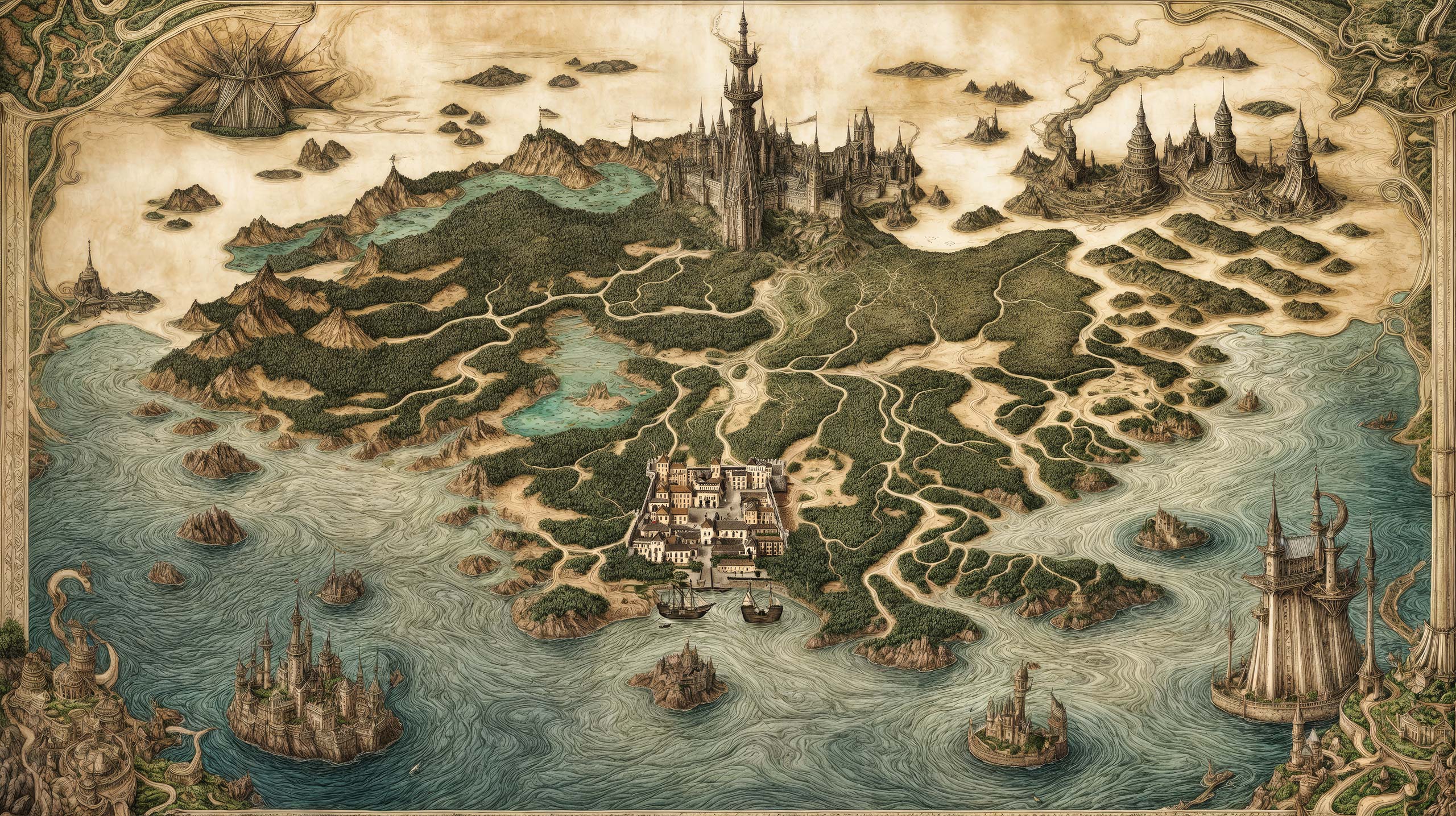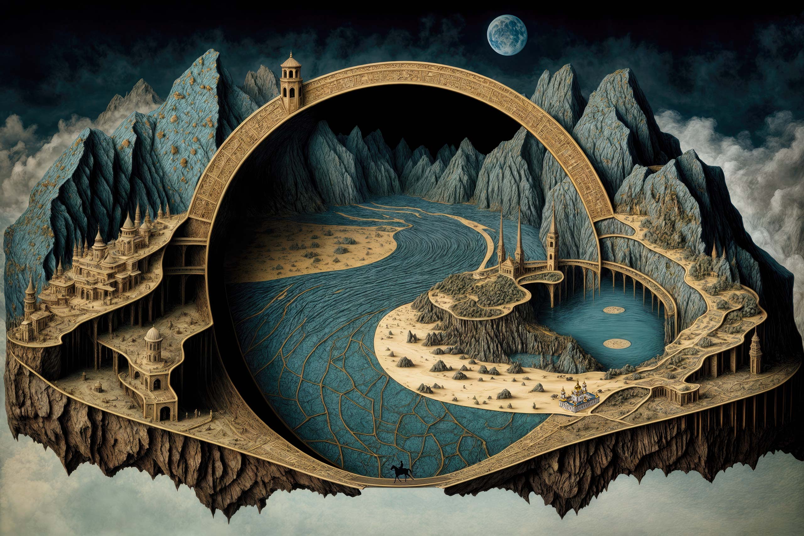 “Terra Incognita” embraces this sense of mystery, revealing unexplored lands brimming with imagination, rooted in ancient myths and folklore. These maps depict unknown territories beyond the seas, pieced together from fragmented memories, legendary tales, and the accounts of a few daring explorers. Each map, both ancient and symbolic, is a canvas of cryptic riddles yearning to be solved. Hidden pathways and intricate mazes lie in wait, promising untold treasures to those who dare to explore.
