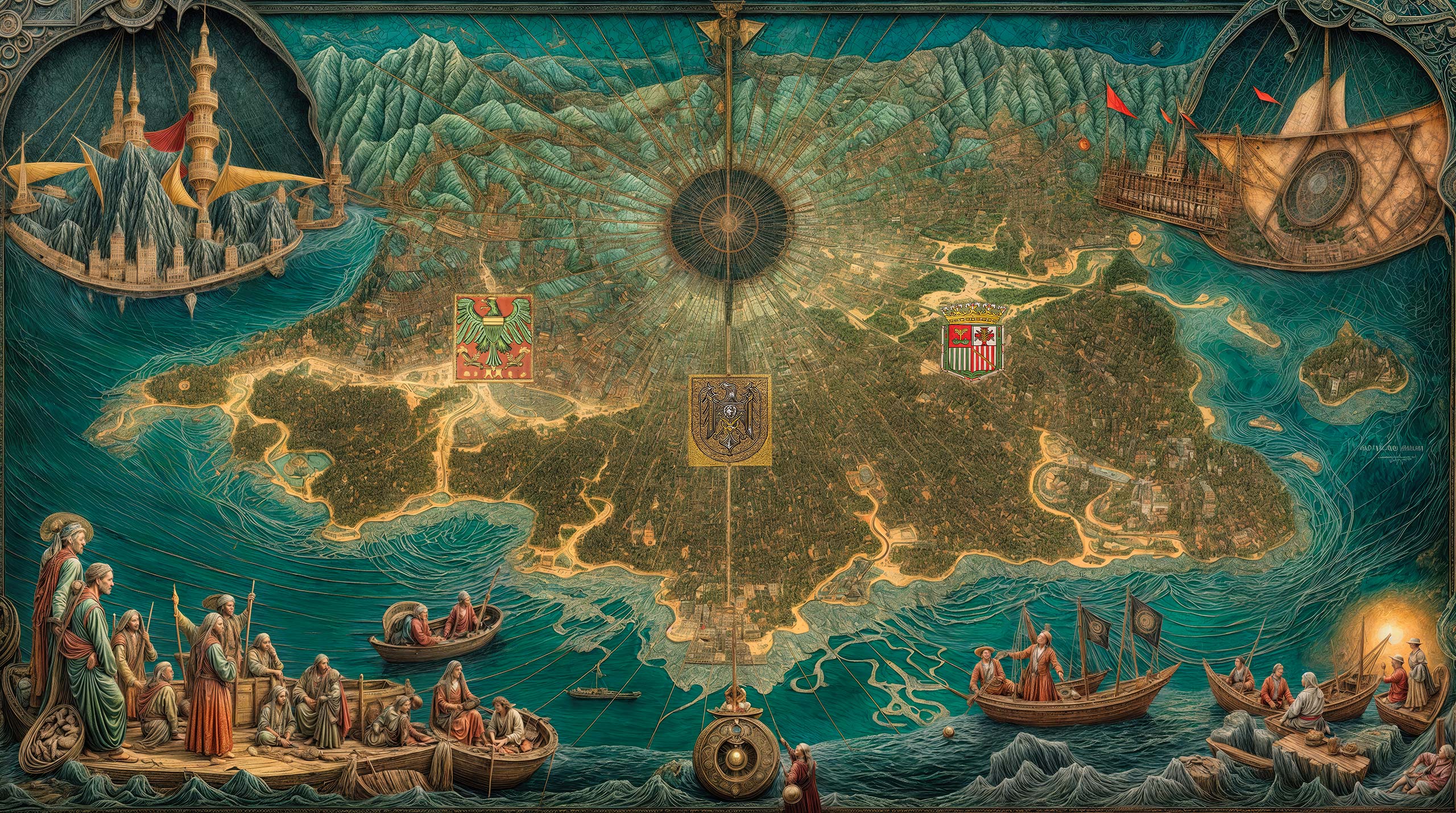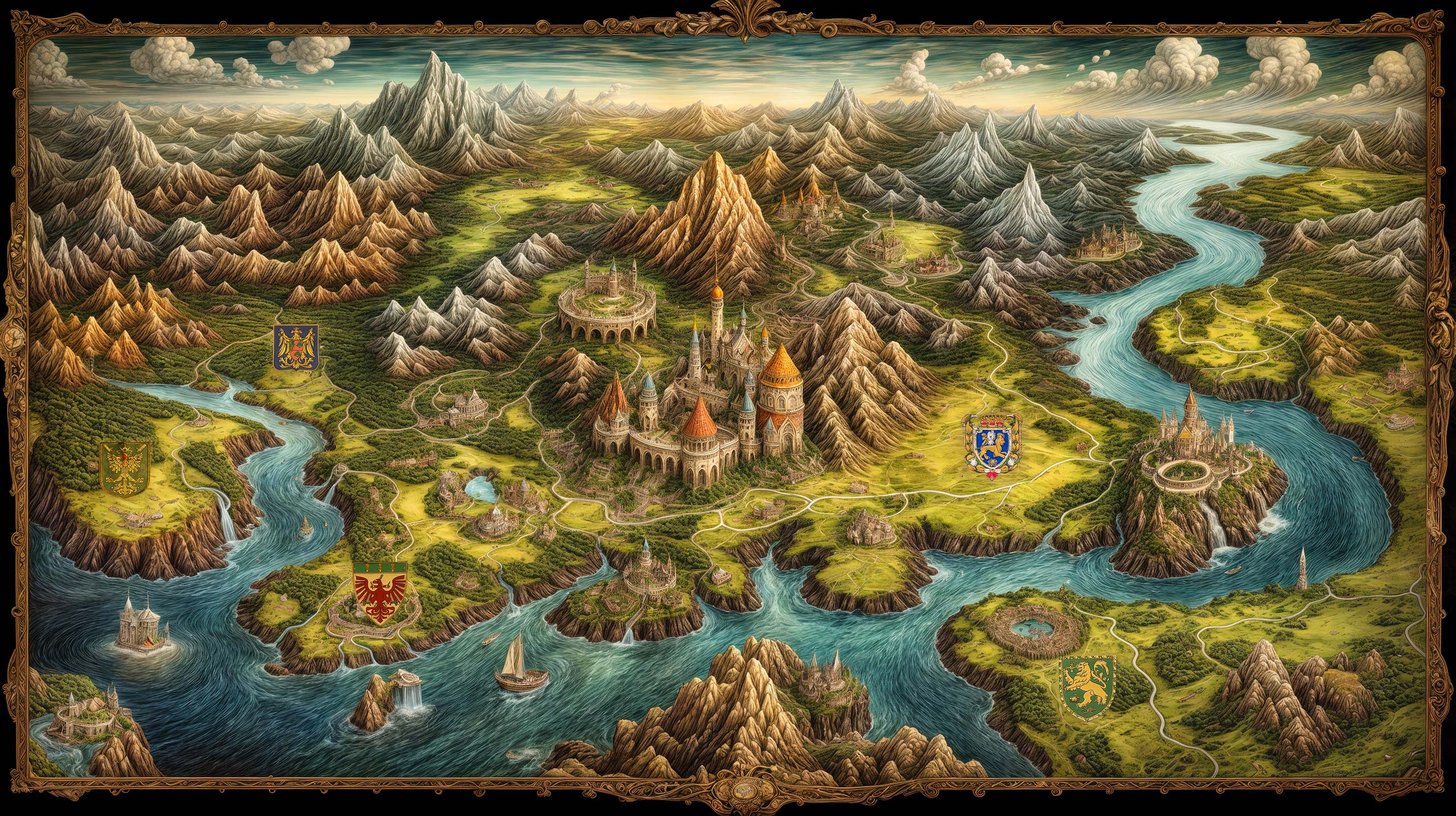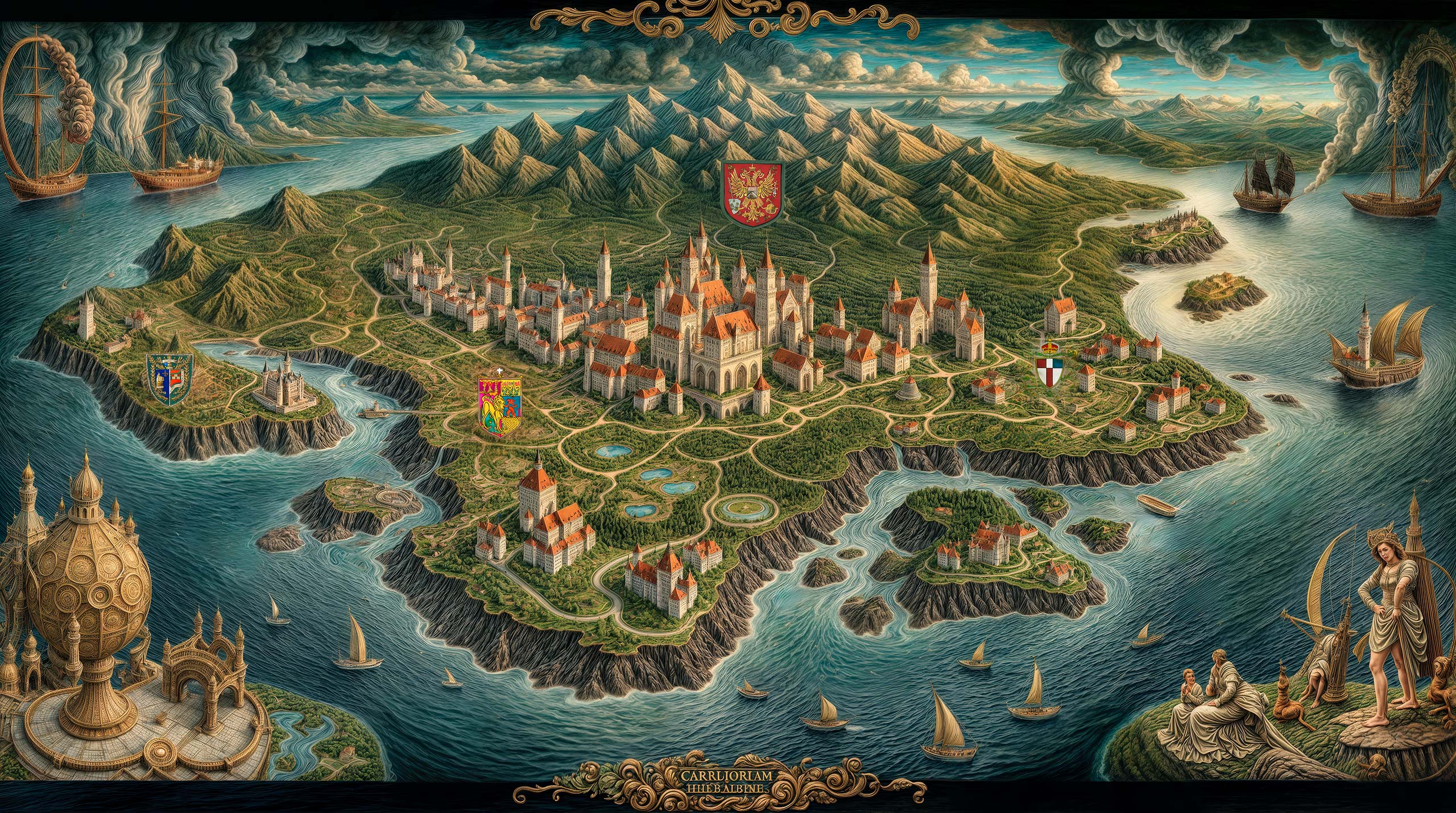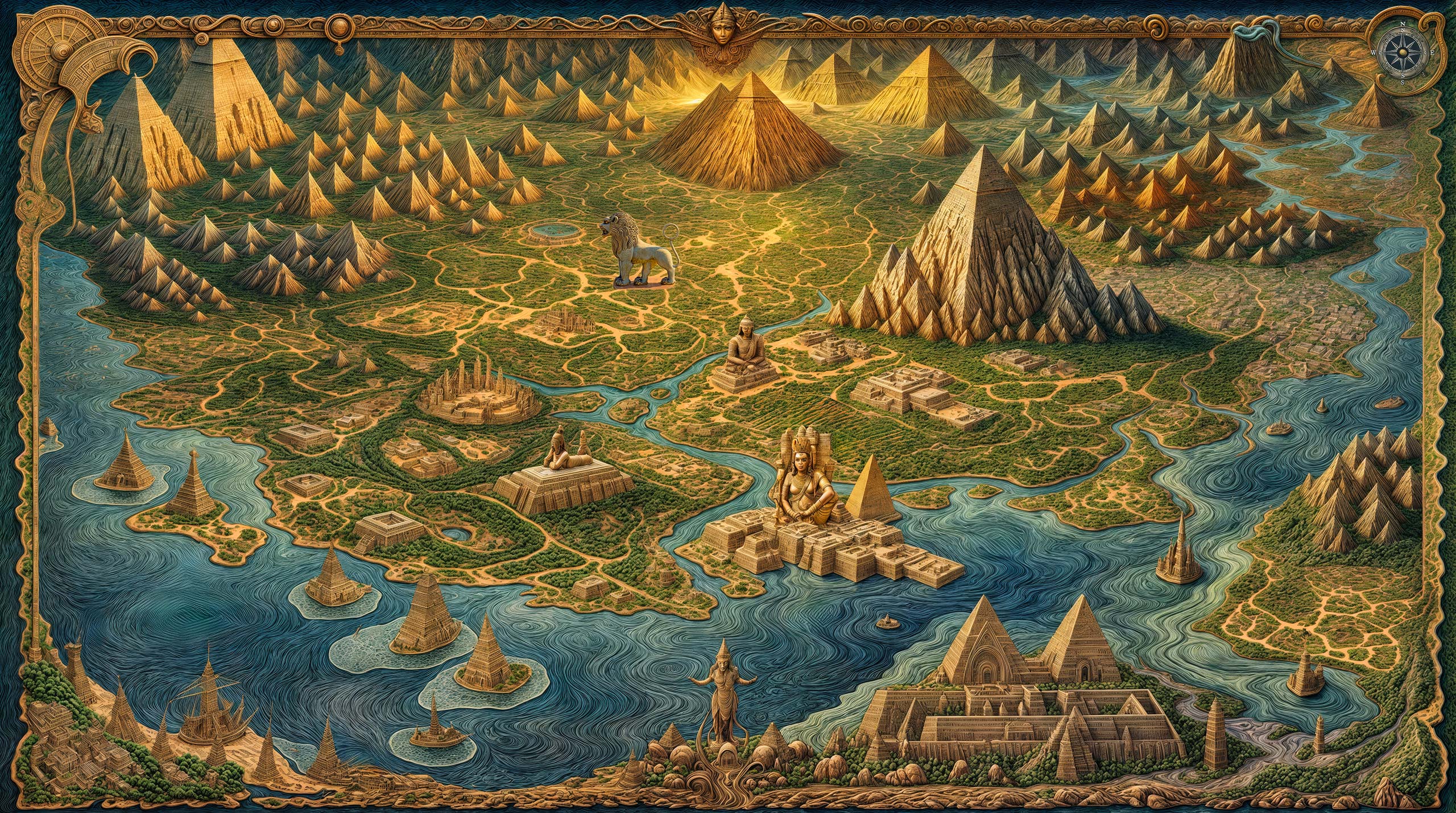 Moreover, the widespread belief in divinely ordered cosmos influenced ancient mapmaking and was reflected in maps and city plans incorporating sacred geometry. Many ancient maps and city plans were aligned with celestial bodies, such as the sun, moon, and stars, highlighting their religious and cultural significance. Religious symbols and icons were frequently integrated into maps, such as depictions of gods, saints, or sacred animals, to convey the divine protection over the land and its inhabitants. In a similar vein, as your eyes traverse the realms of “Terra Incognita”, you will encounter diverse mythic guardians watching over their lands alongside hidden symbols, armorial bearings and sacred markings.