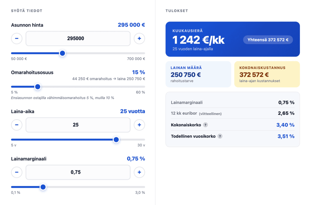 Asuntolainalaskuri on yksi yleinen interaktiivinen tiedon visualisointi, joka löytyy monien pankkien sivuilta. Aiemmin tällaisen toteuttaminen olisi voinut vaatia pieneltä tiimiltä useita työpäiviä, mutta nyt vastaava työkalu voidaan rakentaa tekoälyn avulla muutamine iteraatioineen jopa puolessa tunnissa. Katso täältä luomani asuntolainalaskuri, jonka käyttöliittymä ja toiminnallisuus eivät juuri häviä esimerkiksi Nordean sivujen laskurille. Samaan tapaan toteutin myös korkoa korolle -laskurin, jolla voi arvioida sijoitusten odotettuja tuottoja.