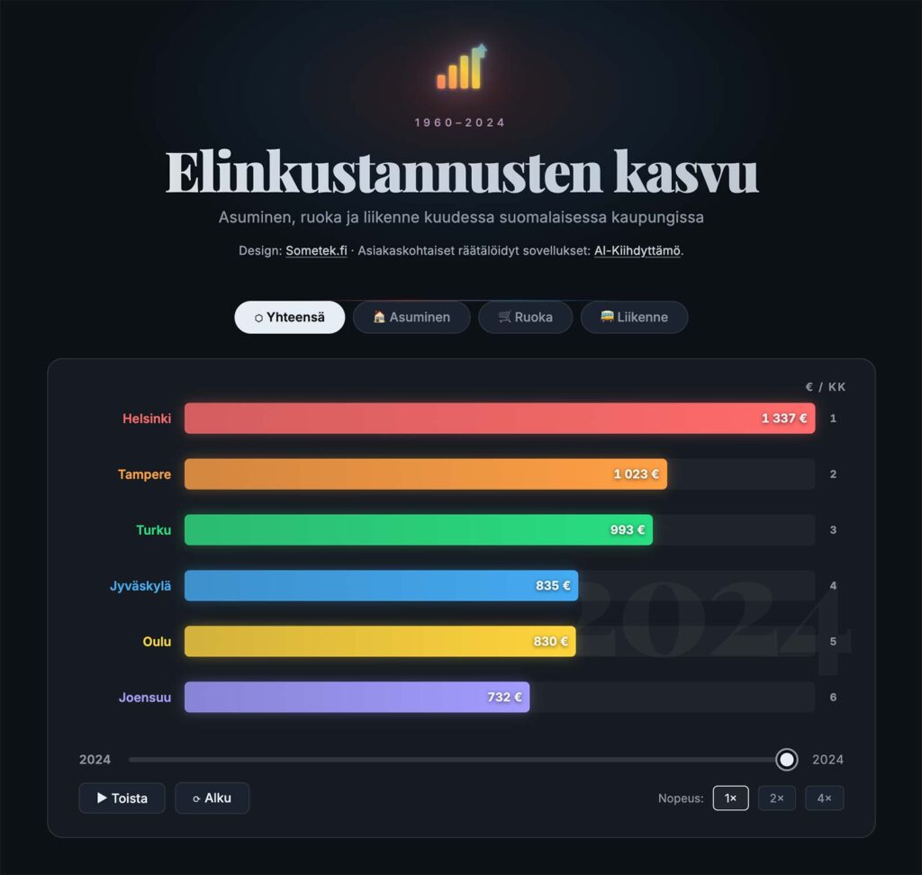 Elinkustannusten kasvua Suomen eri kaupungeissa vuodesta 1960 tähän päivään voit tarkastella täällä luomassani interaktiivisessa infografiikassa. Eriteltynä asumisen, ruuan ja liikenteen osuudet. Tiedot perustuvat Tilastokeskuksen avoimeen dataan.