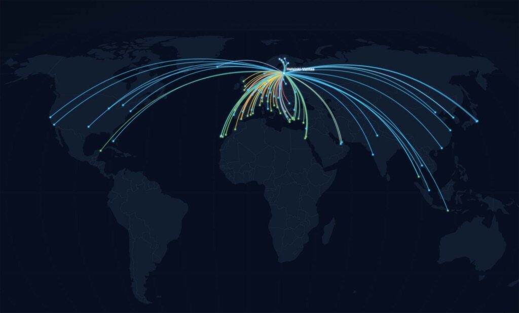 Helsinki-Vantaan lentokentän lentoreittejä voi tutkia luomassani interaktiivisessa reittikartassa. Karttaa voi suodattaa lentoyhtiön, kohdemaiden ja sesongin mukaan, ja jokaisesta reitistä löytyy myös syventävää tietoa. Data perustuu Finavian avoimeen rajapintaan.