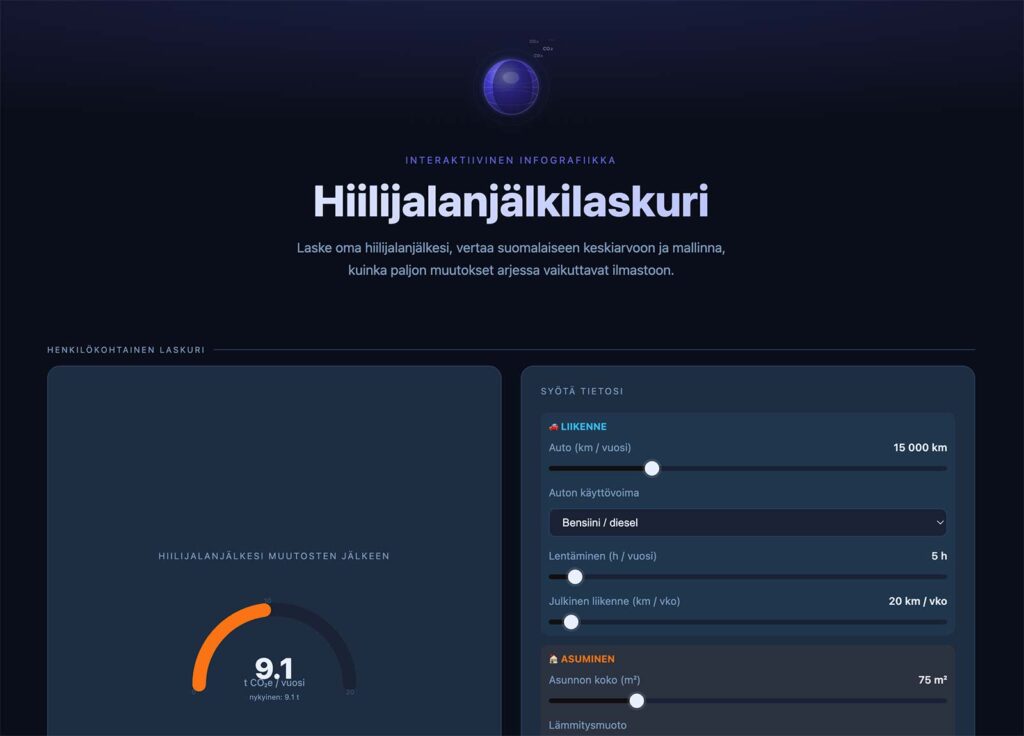Luomani hiilijalanjälkilaskuri auttaa arvioimaan omaa hiilijalanjälkeä ja vertaamaan sitä Suomen ja Euroopan keskiarvoihin. Lisäksi käyttäjä voi mallintaa, miten omia valintoja muuttamalla kulutusta ja päästöjä voisi vähentää. Tämä on hyvä esimerkki siitä, miten yhteiskunnallisesta ilmiöstä tehdään henkilökohtainen ja samalla kiinnostavampi.