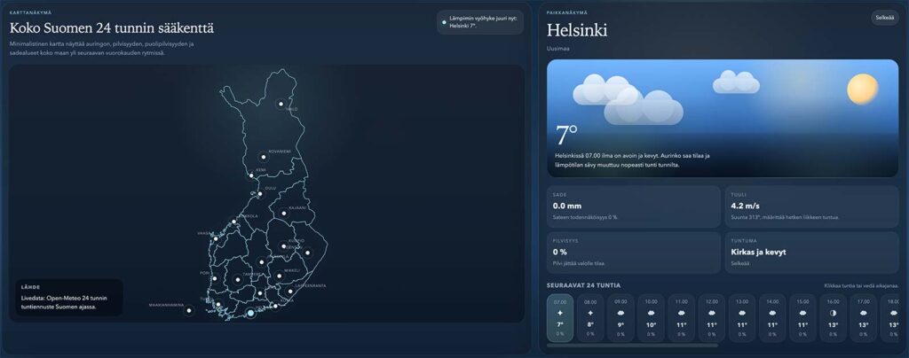 Interaktiivinen säästudio Suomen sää sisältää sääkartan, paikallissään, hakutoimminnon ja aikajanan interaktiivisina näkyminä. Säätiedot haetaan Open Meteo rajapinnasta.