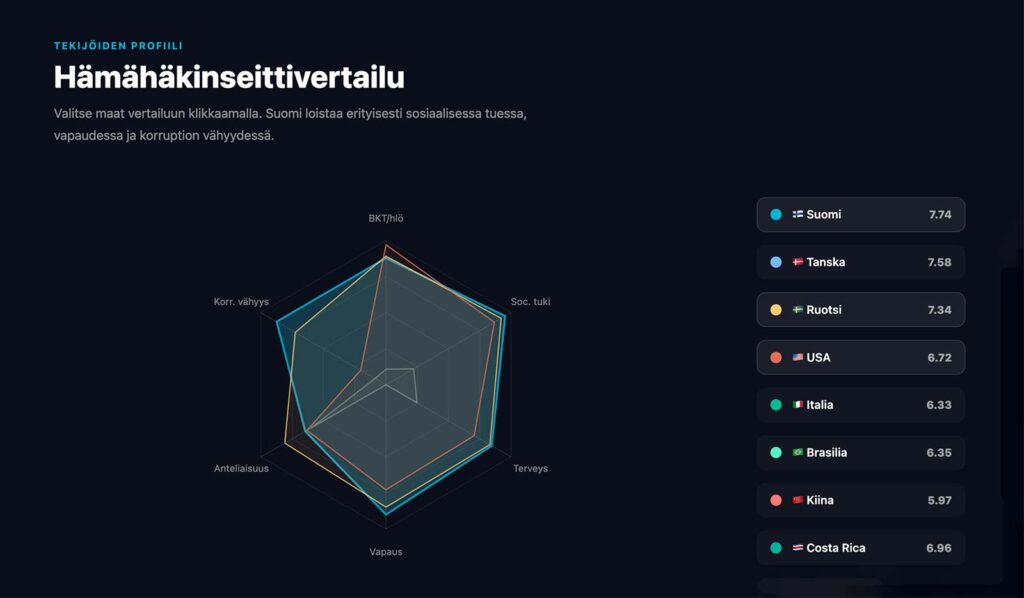 Moniosainen interaktiivinen infografiikka näyttää, mistä onnellisuus rakentuu Suomessa ja muualla maailmassa. Käyttäjä voi vertailla eri maiden onnellisuutta hämähäkinseittigrafiikan avulla ja saada lisätietoa hover-efekteillä.