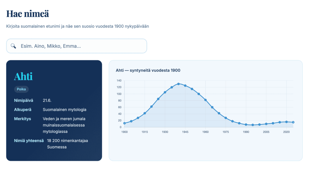Hae etunimiä ja näe niiden suosio graafina vuosilta 1900–2020. Tutki nimien aikajanaa, nimifaktoja, epätavallisten nimien kokoelmaa ja nimien alkuperää.