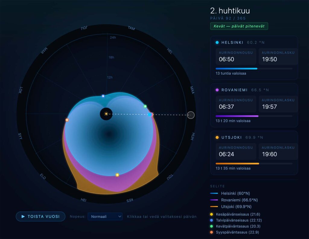 Suomen aurinkokalenteri näyttää kellomaisessa muodossa, kuinka päivänvalon määrä vaihtelee Helsingissä, Rovaniemellä ja Utsjoella eri vuodenaikoina. Käyttäjä voi myös animoida infografiikan ja nähdä muutoksen elävänä esityksenä. Data tähän hain Ilmatieteen laitoksen avoimesta rajapinnasta.