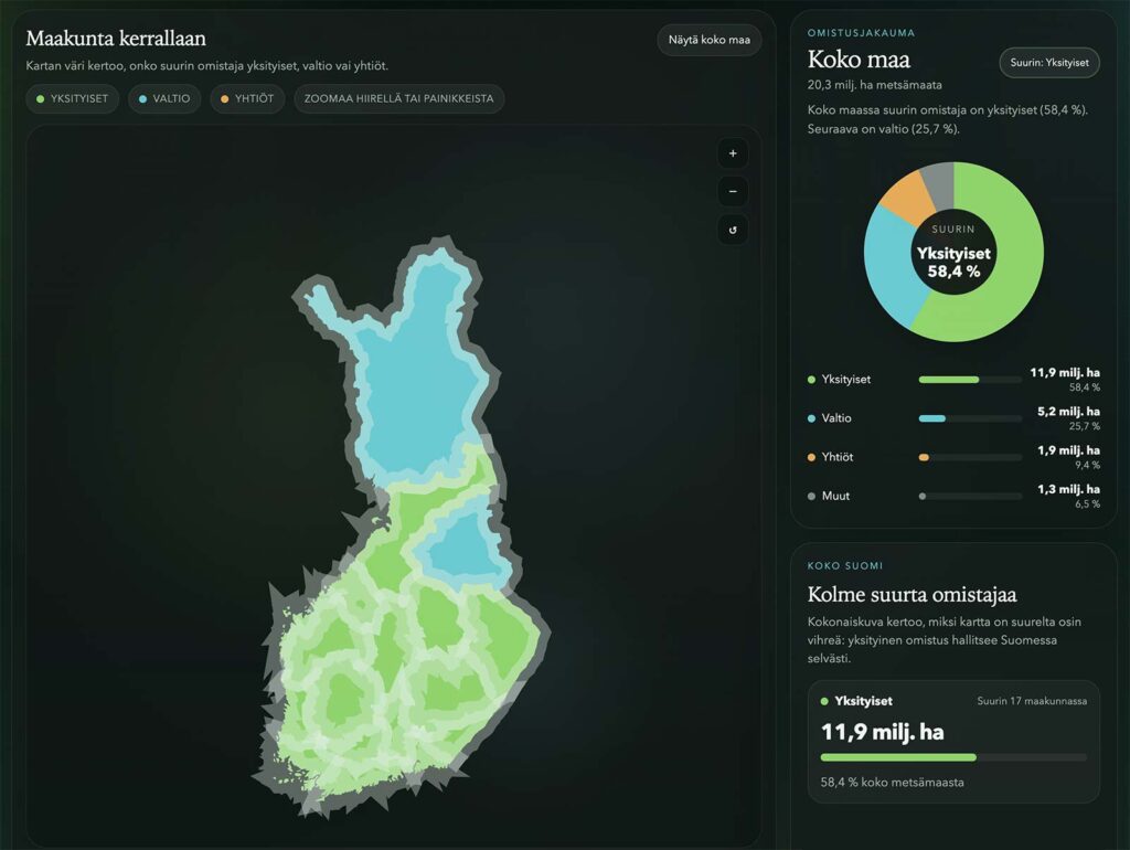 Suomen metsät -kuka ne omistaa? -infografiikka näyttää interaktiivisena karttana metsien omistuksen. Lähteenä käytetty luonnonvarakeskuksen tietoja.