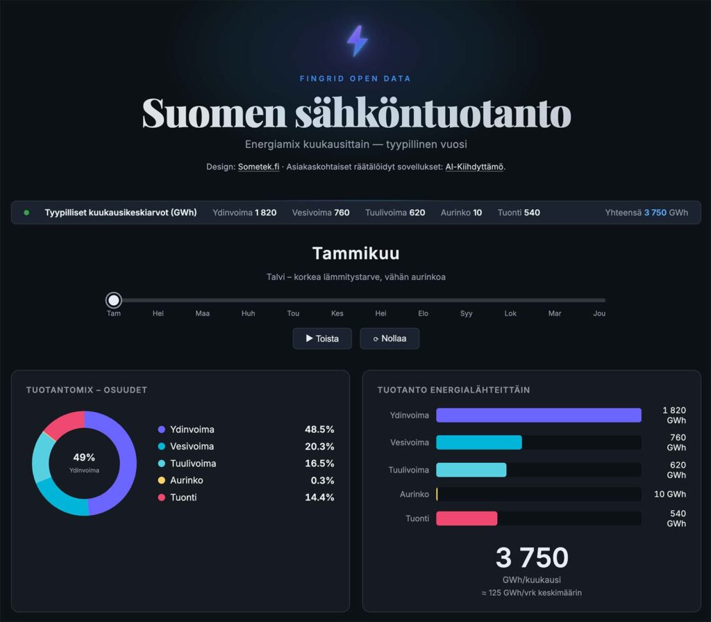 Suomen sähköntuotanto -infografiikka visualisoi Suomen sähkönkulutuksen, eri energialähteiden — kuten ydinvoiman, vesivoiman, tuulivoiman, aurinkoenergian ja tuonnin — osuudet sekä niiden kuukausittaisen vaihtelun. Myös tämän infografiikan käyttäjä voi halutessaan animoida. Datan visualisointiin hain Fingridin avoimesta rajapinnasta.