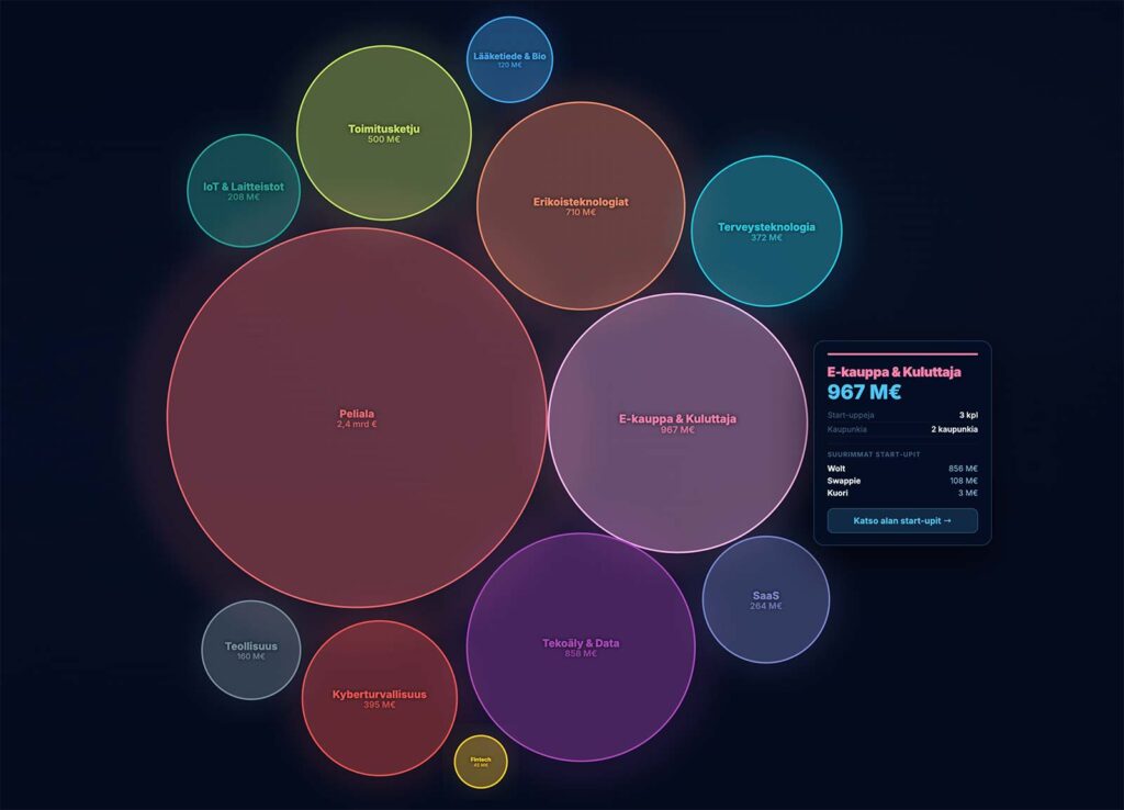 Suomen start-up ekosysteemi -infografiikka näyttää eri alojen ja yritysten osuudet start-upien rahoituksesta. Suodata näkymää toimialan, kaupungin ja rahoituskierrosten perusteella.