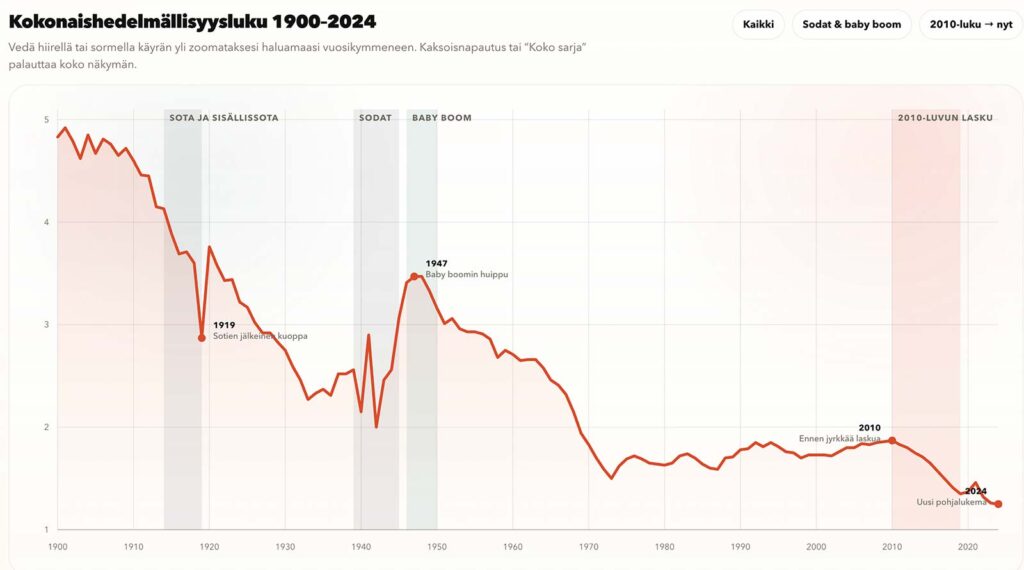Suomen syntyvuuden romahdus -infografiikka sisältää interaktiivisen graafin, josta voi tutkia syntyvyyden muutosta ja sen takana olevia syitä. Lähteenä Tilastokeskus.
