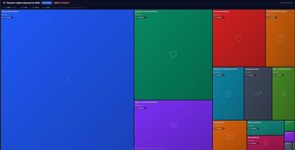 Suomen valtion budjettia voi hahmottaa visuaalisesti luomastani infografiikasta. Siinä voi tutkia, miten budjetti jakautuu eri ministeriöiden kesken ja edelleen tarkemmin esimerkiksi eläkkeisiin, sosiaaliturvaan, koulutukseen ja puolustukseen. Tiedot perustuvat Suomen vuoden 2025 talousarvioon.