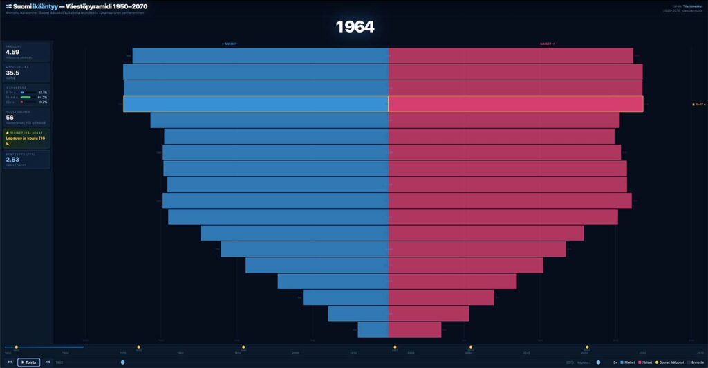 Toteuttamani Suomi ikääntyy -infografiikka visualisoi Suomen ikärakenteen muutosta vuosina 1950–2070. Sen avulla voi tutkia esimerkiksi huoltosuhteen kehitystä, syntyvyyttä ja suurten ikäluokkien osuutta väestöstä. Grafiikan data perustuu Tilastokeskuksen aineistoihin.