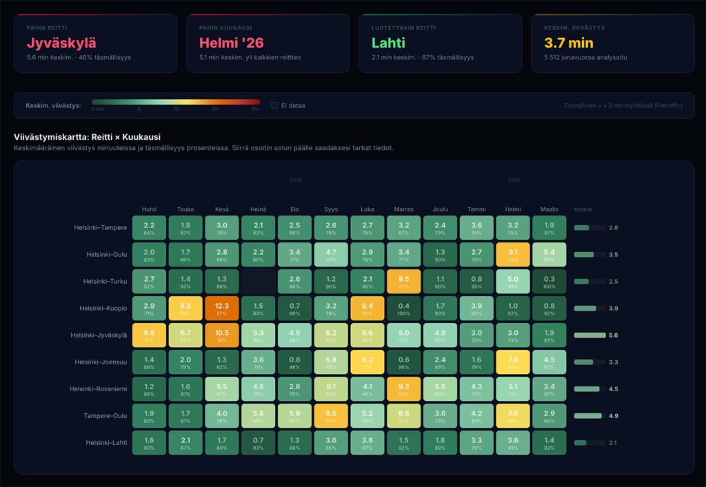 Luomani interaktiivinen visualisointi näyttää VR:n junien myöhästymiset vuosina 2025–2026 viivästymiskarttana. Se havainnollistaa selkeästi ne reitit ja kuukaudet, jolloin myöhästymisen riski on tilastollisesti suurin. Data on haettu VR:n rajapinnasta.