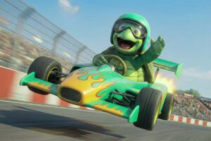 Mainoksessa Autokilpailutuksen vihreää brändiväriä edustava kilpikonna kaahaa lähes lentäen voittoon, jättäen kilpailijat kauas taustapeiliin. Kilpailijoiden värejä kantavat sininen ja punainen kilpikonna jäävät lähtösuoralle, kun vihreä ottaa turbon käyttöön.